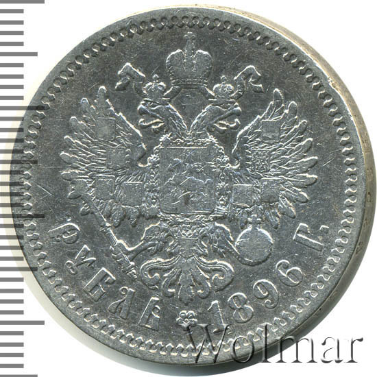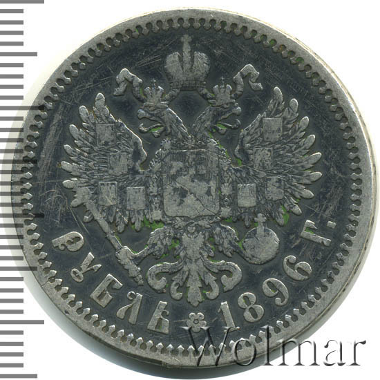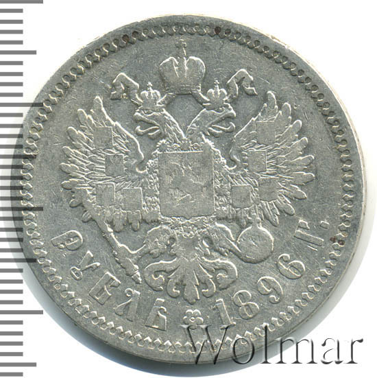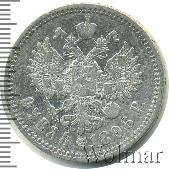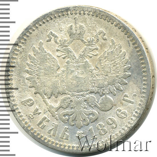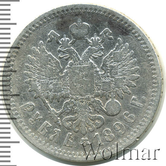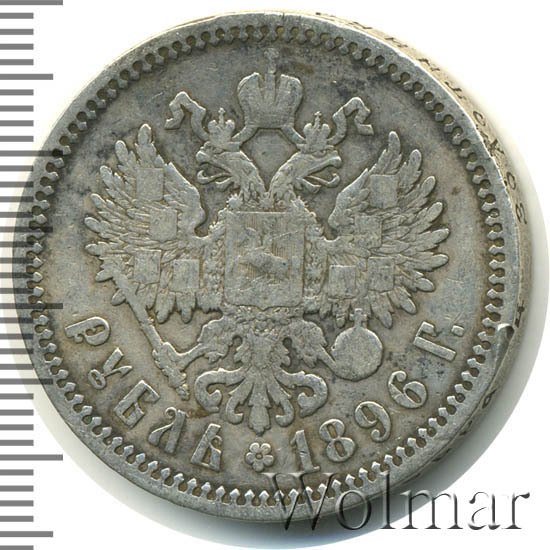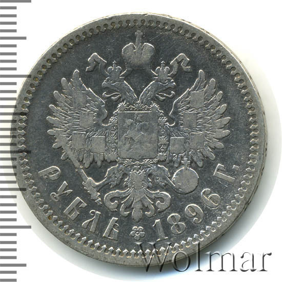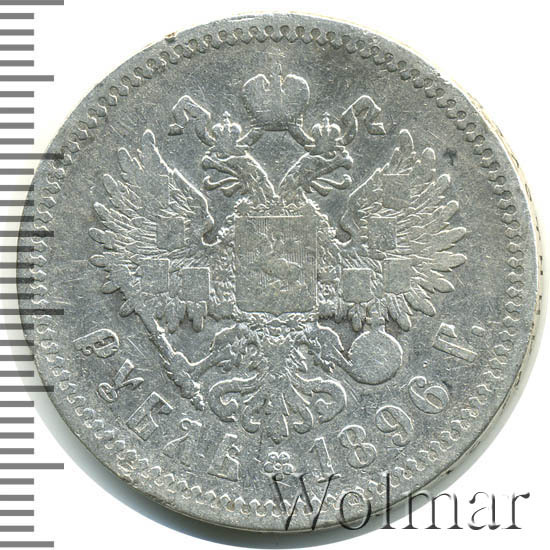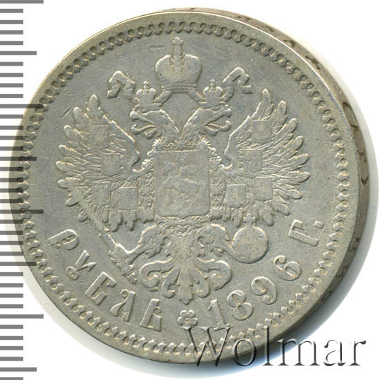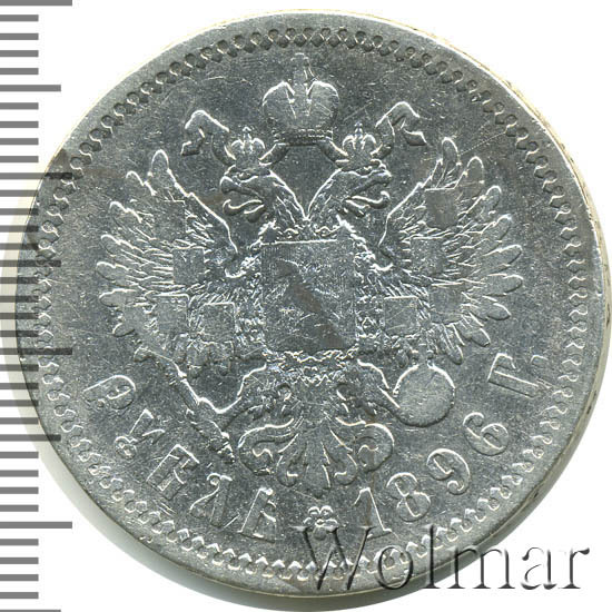 В центре изображен Малый Государственный Герб Российской империи - двуглавый орёл, головы которого увенчаны двумя коронами, третья, большая корона над ними. Все они соединены орденской лентой ордена Св. Апостола Андрея Первозванного. На груди орла расположен Московский герб, в щите изображен Георгий Победоносец с копьем поражающий дракона. Вокруг щита цепь ордена Св. Апостола Андрея Первозванного. На крыльях изображены гербы: Царства Казанского, Польского, Херсонеса Таврического, Астраханского, Сибирского, Грузинского и герб соединенных княжеств Киевского, Новгородского и Владимирского — по 4 на каждое крыло. В правой лапе орла – скипетр, в левой – держава. Под ним слева направо изображены: номинал - надпись «РУБЛЬ», цветочная розетка и дата выпуска «1896 Г.». По окружности канта имеются рельефные элементы, выполненные в виде зубцов.