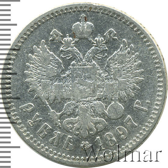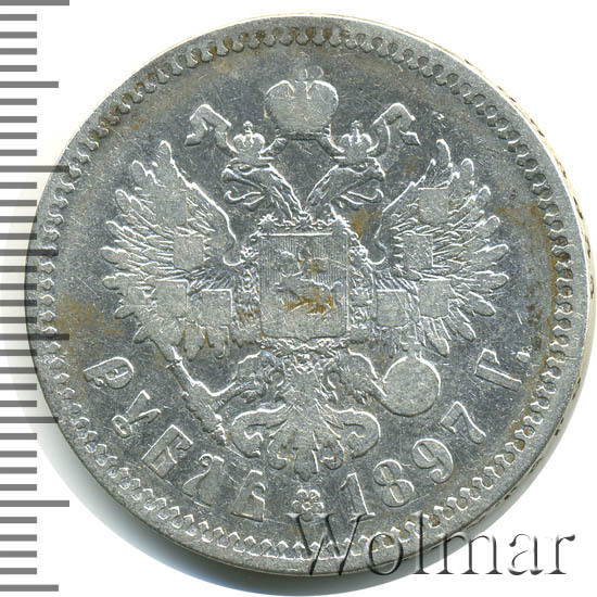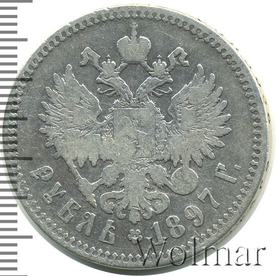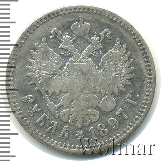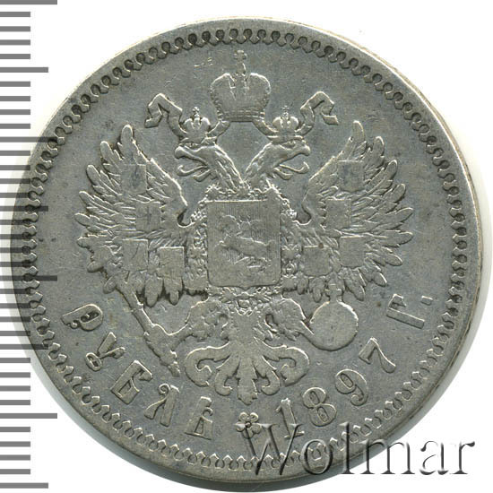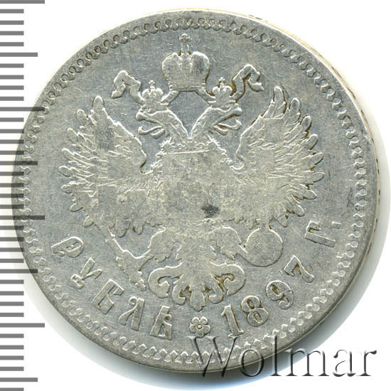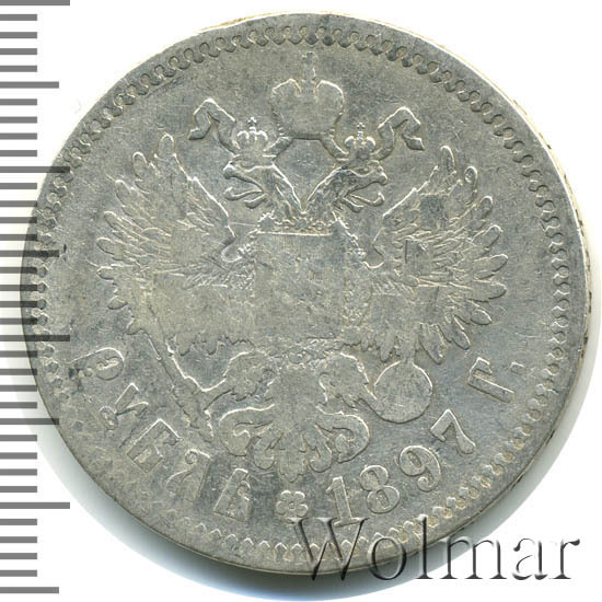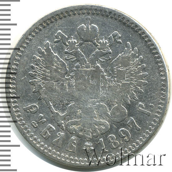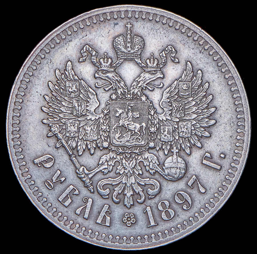 В центре изображен Малый Государственный Герб Российской империи - двуглавый орёл, головы которого увенчаны двумя коронами, третья, большая корона над ними. Все они соединены орденской лентой ордена Св. Апостола Андрея Первозванного. На груди орла расположен Московский герб, в щите изображен Георгий Победоносец с копьем поражающий дракона. Вокруг щита цепь ордена Св. Апостола Андрея Первозванного. На крыльях изображены гербы: Царства Казанского, Польского, Херсонеса Таврического, Астраханского, Сибирского, Грузинского и герб соединенных княжеств Киевского, Новгородского и Владимирского — по 4 на каждое крыло. В правой лапе орла – скипетр, в левой – держава. Под ним слева направо изображены: номинал - надпись «РУБЛЬ», цветочная розетка и дата выпуска «1897 Г.». По окружности канта имеются рельефные элементы, выполненные в виде зубцов.