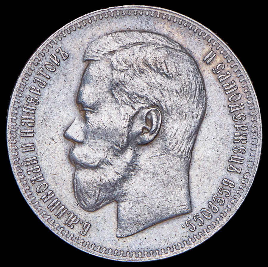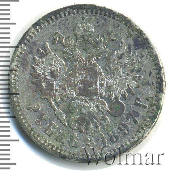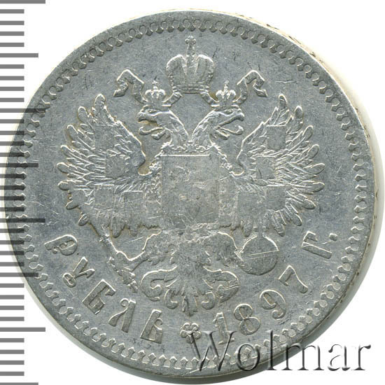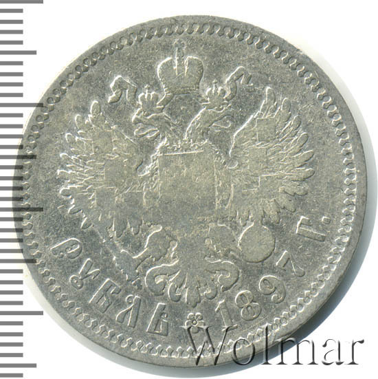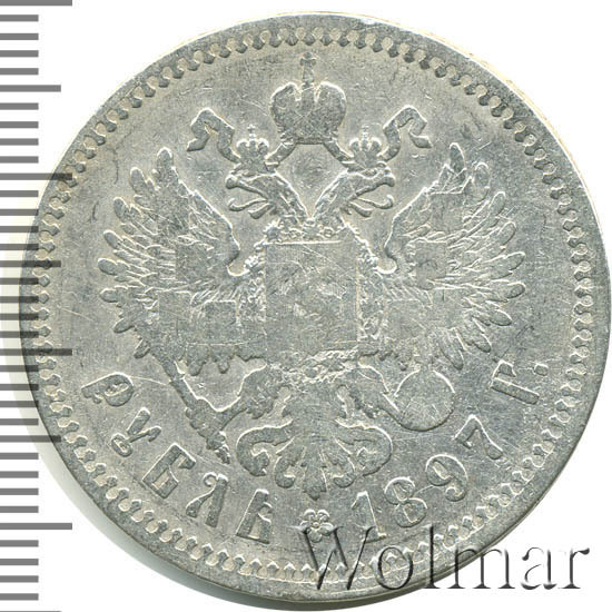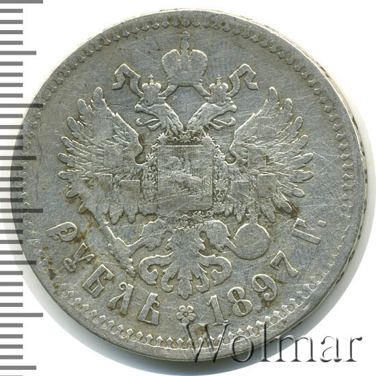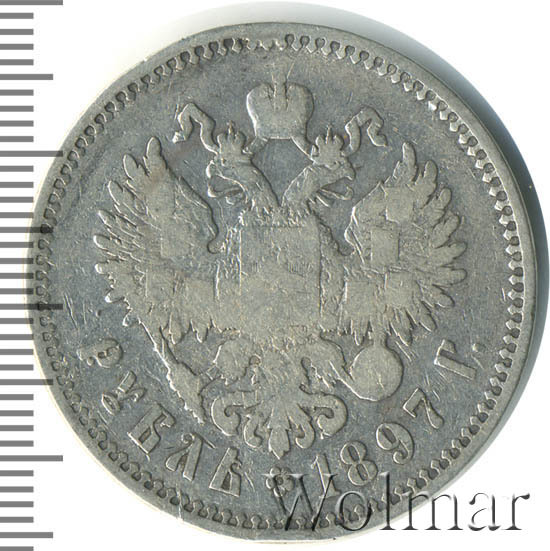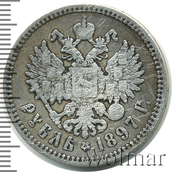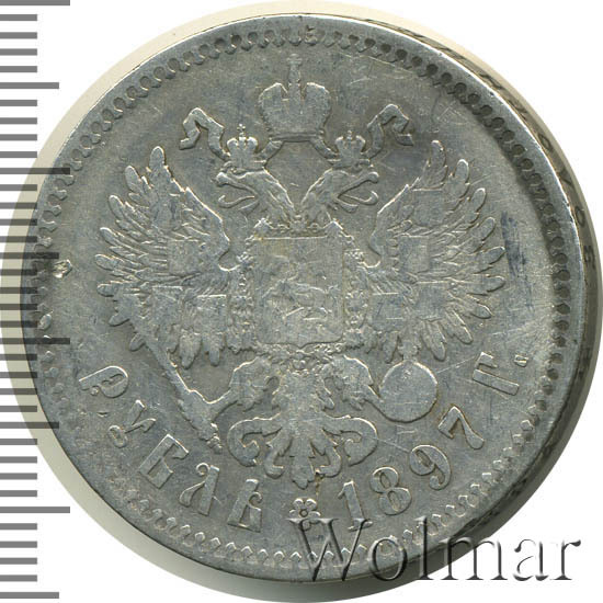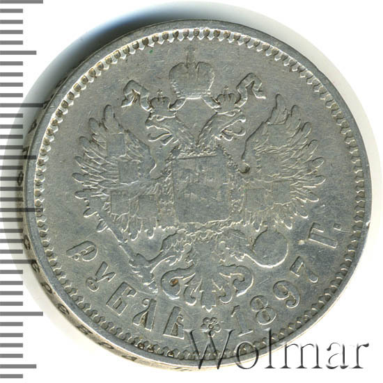 В центре изображен Малый Государственный Герб Российской империи - двуглавый орёл, головы которого увенчаны двумя коронами, третья, большая корона над ними. Все они соединены орденской лентой ордена Св. Апостола Андрея Первозванного. На груди орла расположен Московский герб, в щите изображен Георгий Победоносец с копьем поражающий дракона. Вокруг щита цепь ордена Св. Апостола Андрея Первозванного. На крыльях изображены гербы: Царства Казанского, Польского, Херсонеса Таврического, Астраханского, Сибирского, Грузинского и герб соединенных княжеств Киевского, Новгородского и Владимирского — по 4 на каждое крыло. В правой лапе орла – скипетр, в левой – держава. Под ним слева направо изображены: номинал - надпись «РУБЛЬ», цветочная розетка и дата выпуска «1897 Г.». По окружности канта имеются рельефные элементы, выполненные в виде зубцов.