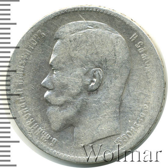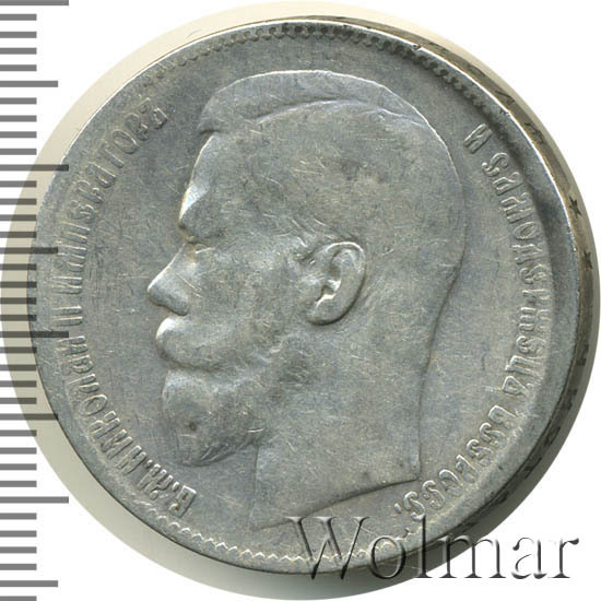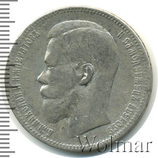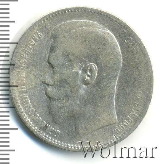В центре профильный портрет влево императора Николая II. Слева надпись «Б.М. НИКОЛАЙ II ИМПЕРАТОР», справа - «И САМОДЕРЖЕЦ ВСЕРОСС.». По окружности канта имеются рельефные элементы, выполненные в виде зубцов.