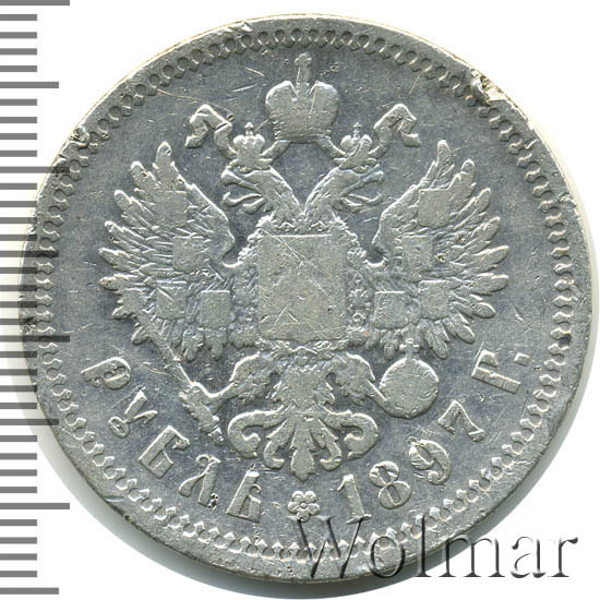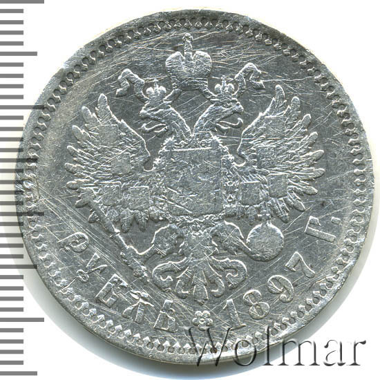 В центре изображен Малый Государственный Герб Российской империи - двуглавый орёл, головы которого увенчаны двумя коронами, третья, большая корона над ними. Все они соединены орденской лентой ордена Св. Апостола Андрея Первозванного. На груди орла расположен Московский герб, в щите изображен Георгий Победоносец с копьем поражающий дракона. Вокруг щита цепь ордена Св. Апостола Андрея Первозванного. На крыльях изображены гербы: Царства Казанского, Польского, Херсонеса Таврического, Астраханского, Сибирского, Грузинского и герб соединенных княжеств Киевского, Новгородского и Владимирского — по 4 на каждое крыло. В правой лапе орла – скипетр, в левой – держава. Под ним слева направо изображены: номинал - надпись «РУБЛЬ», цветочная розетка и дата выпуска «1897 Г.». По окружности канта имеются рельефные элементы, выполненные в виде зубцов.
