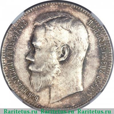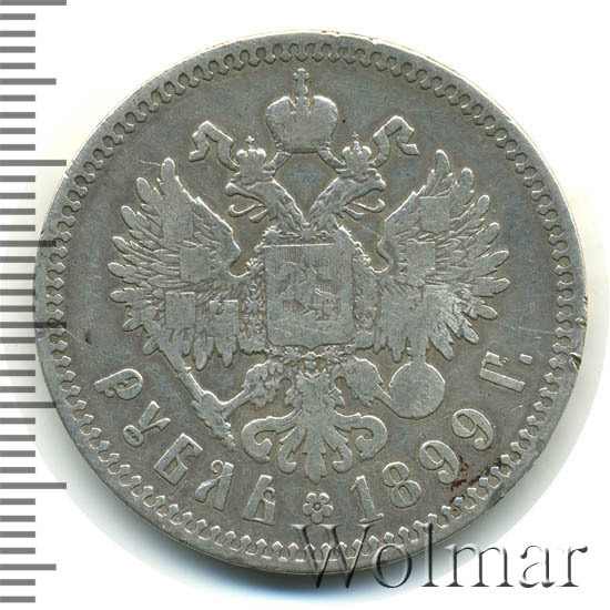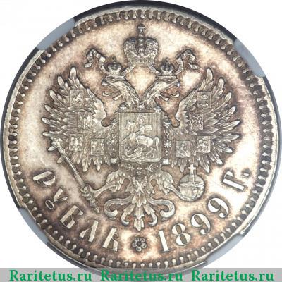 В центре изображен Малый Государственный Герб Российской империи - двуглавый орёл, головы которого увенчаны двумя коронами, третья, большая корона над ними. Все они соединены орденской лентой ордена Св. Апостола Андрея Первозванного. На груди орла расположен Московский герб, в щите изображен Георгий Победоносец с копьем поражающий дракона. Вокруг щита цепь ордена Св. Апостола Андрея Первозванного. На крыльях изображены гербы: Царства Казанского, Польского, Херсонеса Таврического, Астраханского, Сибирского, Грузинского и герб соединенных княжеств Киевского, Новгородского и Владимирского — по 4 на каждое крыло. В правой лапе орла – скипетр, в левой – держава. Под ним слева направо изображены: номинал - надпись «РУБЛЬ», цветочная розетка и дата выпуска «1899 Г.». По окружности канта имеются рельефные элементы, выполненные в виде зубцов.