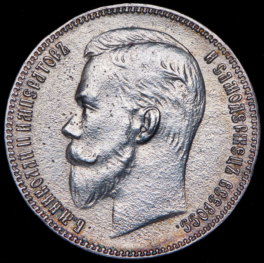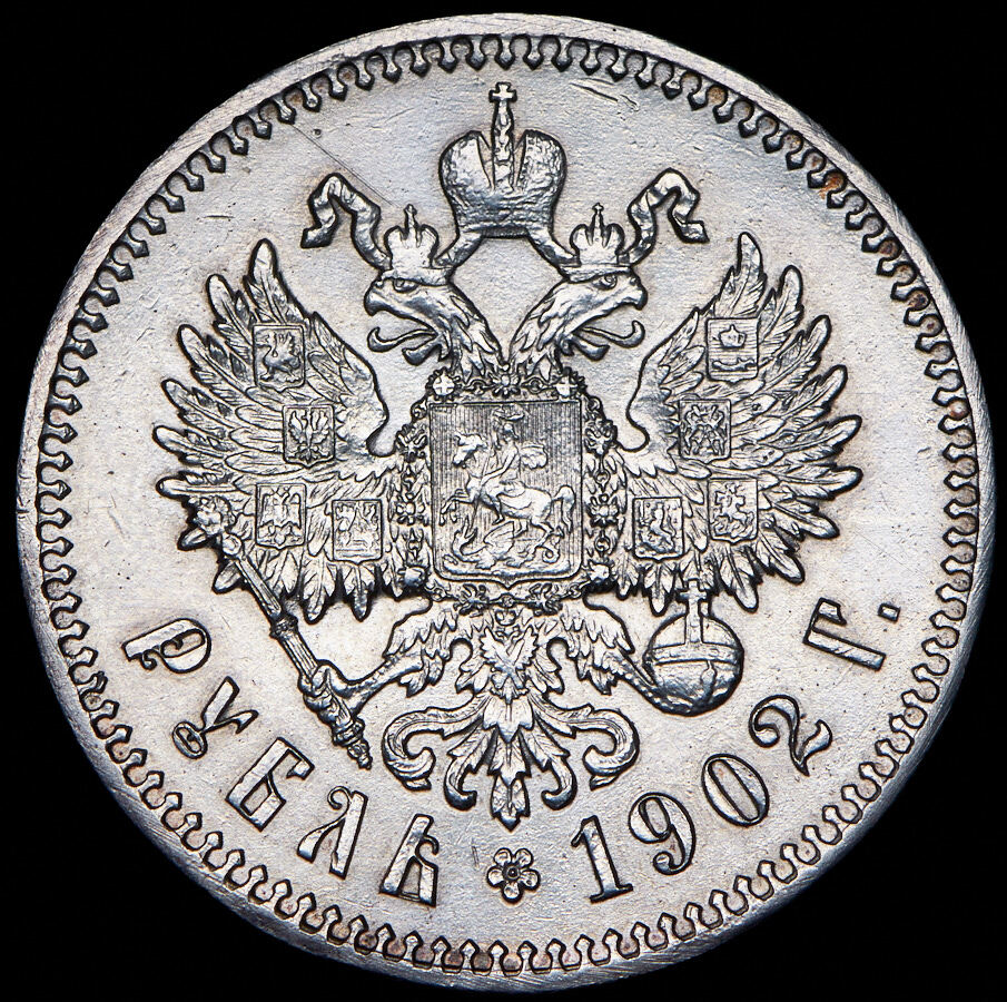 В центре изображен Малый Государственный Герб Российской империи - двуглавый орёл, головы которого увенчаны двумя коронами, третья, большая корона над ними. Все они соединены орденской лентой ордена Св. Апостола Андрея Первозванного. На груди орла расположен Московский герб, в щите изображен Георгий Победоносец с копьем поражающий дракона. Вокруг щита цепь ордена Св. Апостола Андрея Первозванного. На крыльях изображены гербы: Царства Казанского, Польского, Херсонеса Таврического, Астраханского, Сибирского, Грузинского и герб соединенных княжеств Киевского, Новгородского и Владимирского — по 4 на каждое крыло. В правой лапе орла – скипетр, в левой – держава. Под ним слева направо изображены: номинал - надпись «РУБЛЬ», цветочная розетка и дата выпуска «1902 Г.». По окружности канта имеются рельефные элементы, выполненные в виде зубцов.