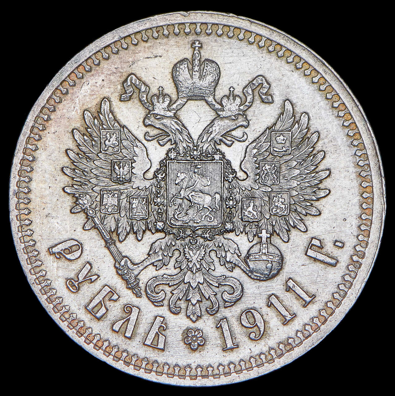 В центре изображен Малый Государственный Герб Российской империи - двуглавый орёл, головы которого увенчаны двумя коронами, третья, большая корона над ними. Все они соединены орденской лентой ордена Св. Апостола Андрея Первозванного. На груди орла расположен Московский герб, в щите изображен Георгий Победоносец с копьем поражающий дракона. Вокруг щита цепь ордена Св. Апостола Андрея Первозванного. На крыльях изображены гербы: Царства Казанского, Польского, Херсонеса Таврического, Астраханского, Сибирского, Грузинского и герб соединенных княжеств Киевского, Новгородского и Владимирского — по 4 на каждое крыло. В правой лапе орла – скипетр, в левой – держава. Под ним слева направо изображены: номинал - надпись «РУБЛЬ», цветочная розетка и дата выпуска «1911 Г.». По окружности канта имеются рельефные элементы, выполненные в виде зубцов.