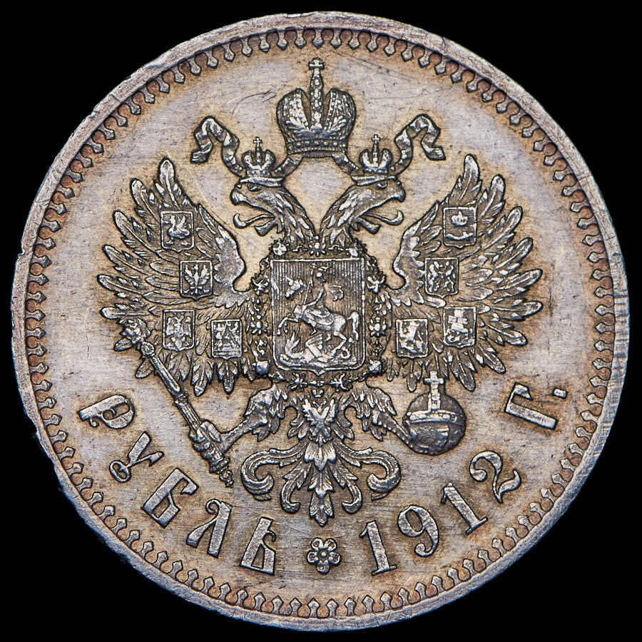 В центре изображен Малый Государственный Герб Российской империи - двуглавый орёл, головы которого увенчаны двумя коронами, третья, большая корона над ними. Все они соединены орденской лентой ордена Св. Апостола Андрея Первозванного. На груди орла расположен Московский герб, в щите изображен Георгий Победоносец с копьем поражающий дракона. Вокруг щита цепь ордена Св. Апостола Андрея Первозванного. На крыльях изображены гербы: Царства Казанского, Польского, Херсонеса Таврического, Астраханского, Сибирского, Грузинского и герб соединенных княжеств Киевского, Новгородского и Владимирского — по 4 на каждое крыло. В правой лапе орла – скипетр, в левой – держава. Под ним слева направо изображены: номинал - надпись «РУБЛЬ», цветочная розетка и дата выпуска «1912 Г.». По окружности канта имеются рельефные элементы, выполненные в виде зубцов.