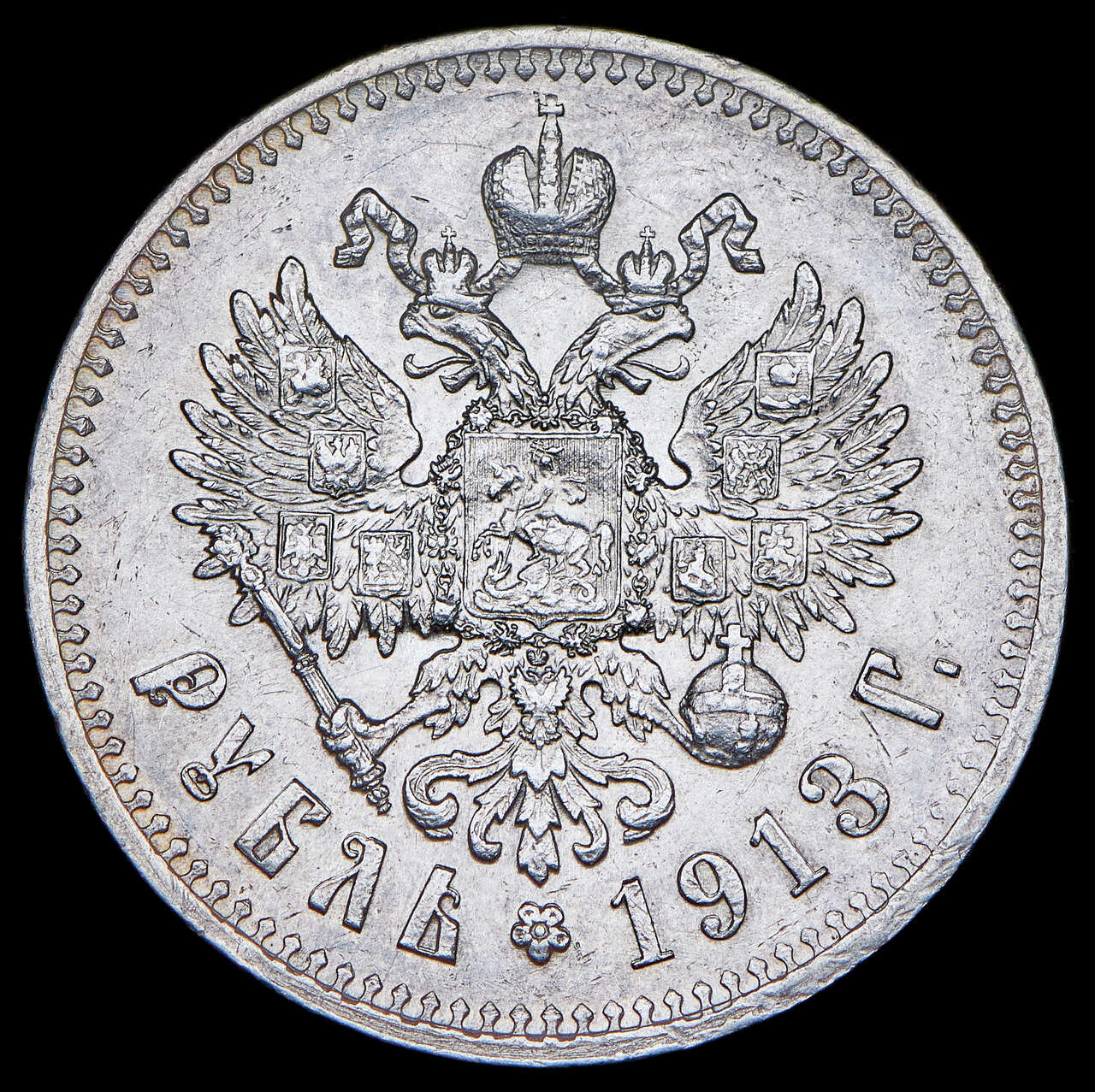 В центре изображен Малый Государственный Герб Российской империи - двуглавый орёл, головы которого увенчаны двумя коронами, третья, большая корона над ними. Все они соединены орденской лентой ордена Св. Апостола Андрея Первозванного. На груди орла расположен Московский герб, в щите изображен Георгий Победоносец с копьем поражающий дракона. Вокруг щита цепь ордена Св. Апостола Андрея Первозванного. На крыльях изображены гербы: Царства Казанского, Польского, Херсонеса Таврического, Астраханского, Сибирского, Грузинского и герб соединенных княжеств Киевского, Новгородского и Владимирского — по 4 на каждое крыло. В правой лапе орла – скипетр, в левой – держава. Под ним слева направо изображены: номинал - надпись «РУБЛЬ», цветочная розетка и дата выпуска «1913 Г.». По окружности канта имеются рельефные элементы, выполненные в виде зубцов.