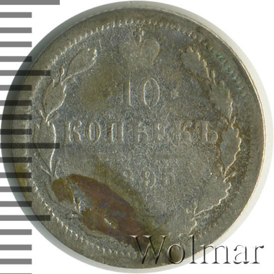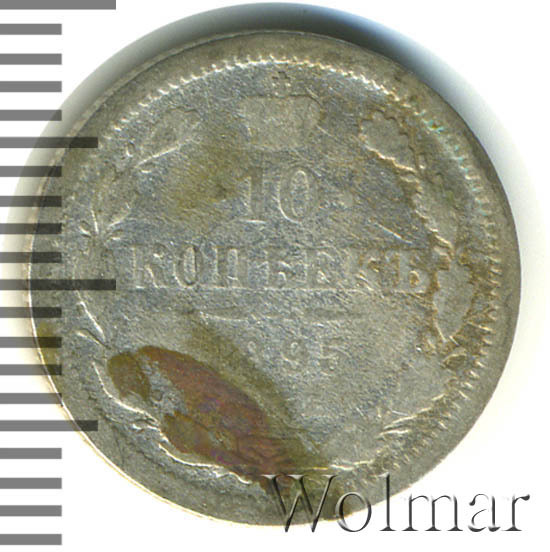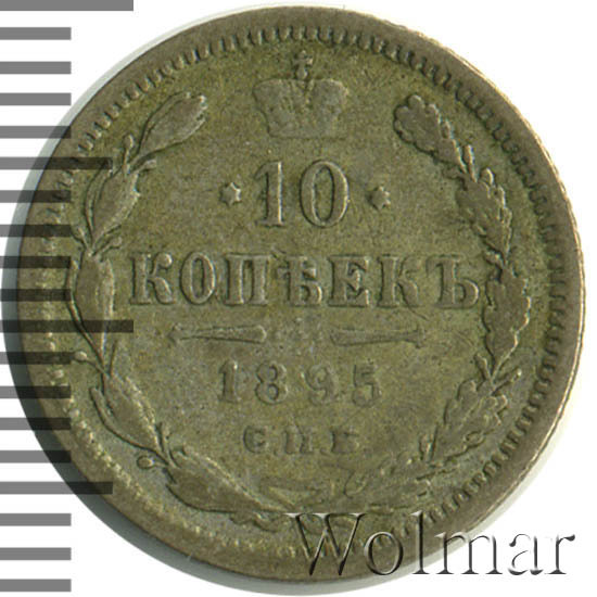 В центре указан номинал «10», ограниченный с обеих сторон звездочками. Над цифрой – Корона Российской империи. Под цифрой номинала — слово "КОПЕЕК". Ниже, расположен декоративный разделитель в виде двух разнонаправленных фигурных линий и стилизованным из точек крестом между ними. Под разделителем — дата выпуска монеты «1895». Под цифрой даты — обозначение монетного двора «С.П.Б.». Вдоль канта, не доходя до короны, изображен венок из лавровой и дубовой ветви, которые в нижней части перевязаны лентой на узел бантом. По окружности канта имеются рельефные элементы, выполненные в виде зубцов.