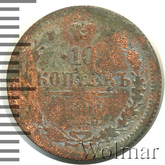 В центре указан номинал «10», ограниченный с обеих сторон звездочками. Над цифрой – Корона Российской империи. Под цифрой номинала — слово "КОПЕЕК". Ниже, расположен декоративный разделитель в виде двух разнонаправленных фигурных линий и стилизованным из точек крестом между ними. Под разделителем — дата выпуска монеты «1899». Под цифрой даты — обозначение монетного двора «С.П.Б.». Вдоль канта, не доходя до короны, изображен венок из лавровой и дубовой ветви, которые в нижней части перевязаны лентой на узел бантом. По окружности канта имеются рельефные элементы, выполненные в виде зубцов.