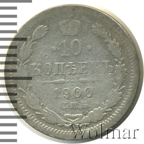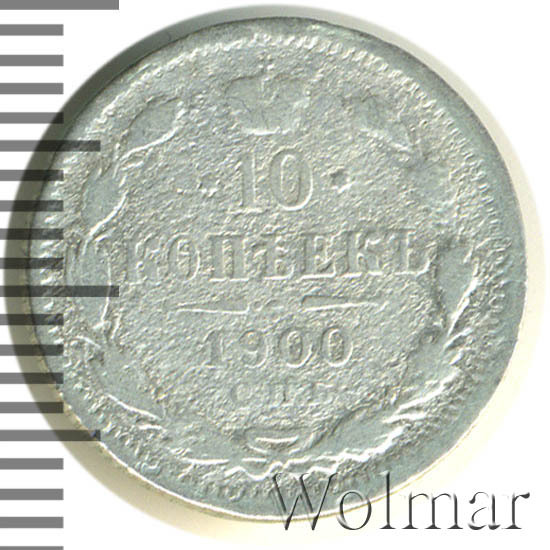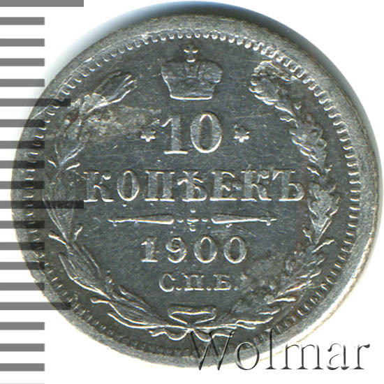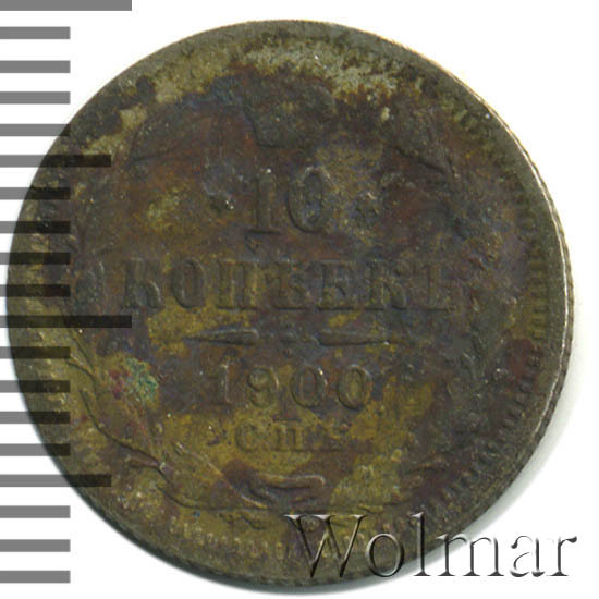 В центре указан номинал «10», ограниченный с обеих сторон звездочками. Над цифрой – Корона Российской империи. Под цифрой номинала — слово "КОПЕЕК". Ниже, расположен декоративный разделитель в виде двух разнонаправленных фигурных линий и стилизованным из точек крестом между ними. Под разделителем — дата выпуска монеты «1900». Под цифрой даты — обозначение монетного двора «С.П.Б.». Вдоль канта, не доходя до короны, изображен венок из лавровой и дубовой ветви, которые в нижней части перевязаны лентой на узел бантом. По окружности канта имеются рельефные элементы, выполненные в виде зубцов.