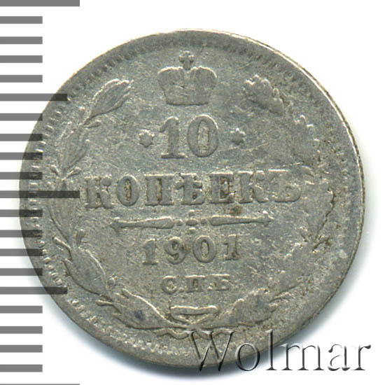 В центре указан номинал «10», ограниченный с обеих сторон звездочками. Над цифрой – Корона Российской империи. Под цифрой номинала — слово "КОПЕЕК". Ниже, расположен декоративный разделитель в виде двух разнонаправленных фигурных линий и стилизованным из точек крестом между ними. Под разделителем — дата выпуска монеты «1901». Под цифрой даты — обозначение монетного двора «С.П.Б.». Вдоль канта, не доходя до короны, изображен венок из лавровой и дубовой ветви, которые в нижней части перевязаны лентой на узел бантом. По окружности канта имеются рельефные элементы, выполненные в виде зубцов.