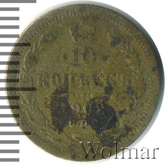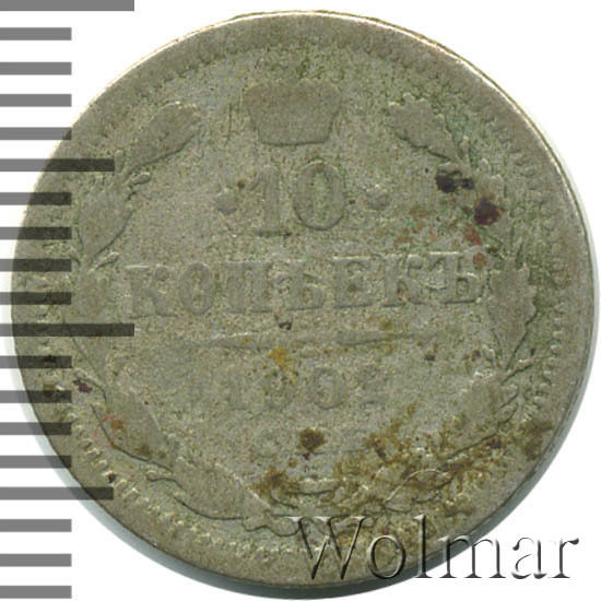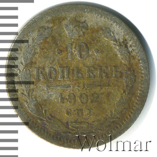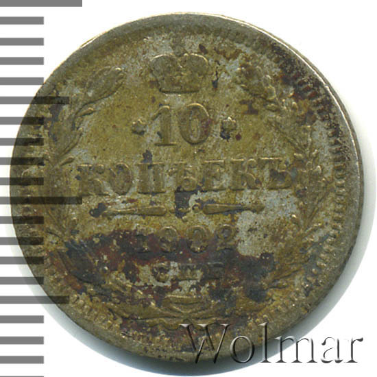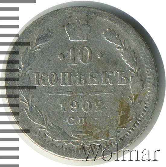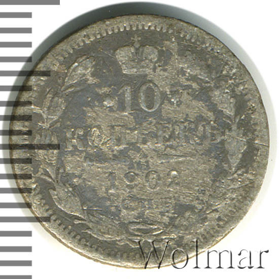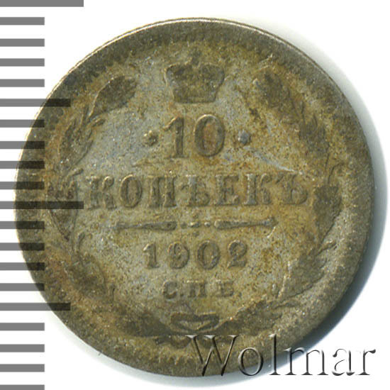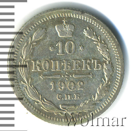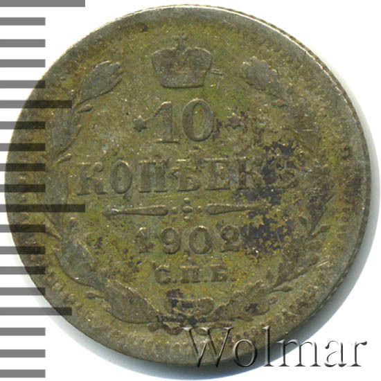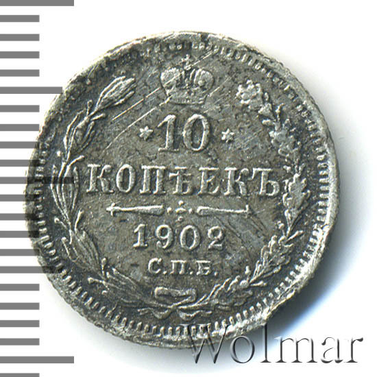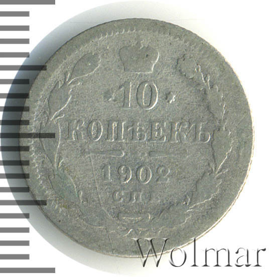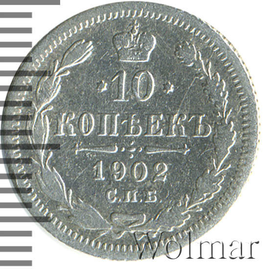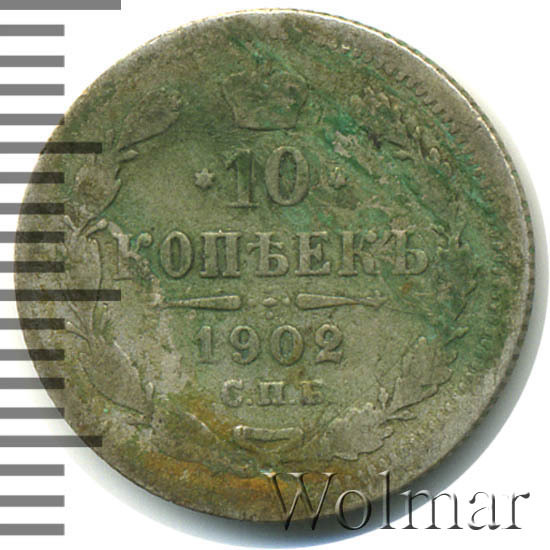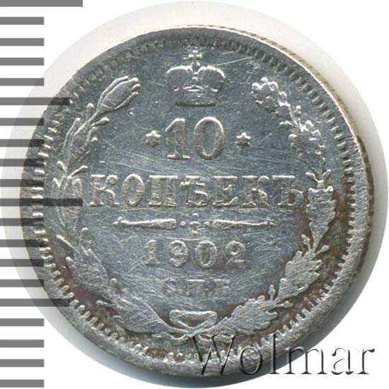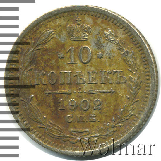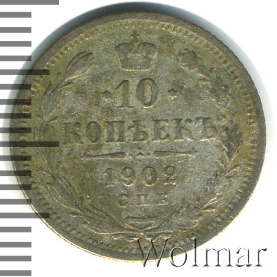 В центре указан номинал «10», ограниченный с обеих сторон звездочками. Над цифрой – Корона Российской империи. Под цифрой номинала — слово "КОПЕЕК". Ниже, расположен декоративный разделитель в виде двух разнонаправленных фигурных линий и стилизованным из точек крестом между ними. Под разделителем — дата выпуска монеты «1902». Под цифрой даты — обозначение монетного двора «С.П.Б.». Вдоль канта, не доходя до короны, изображен венок из лавровой и дубовой ветви, которые в нижней части перевязаны лентой на узел бантом. По окружности канта имеются рельефные элементы, выполненные в виде зубцов.
