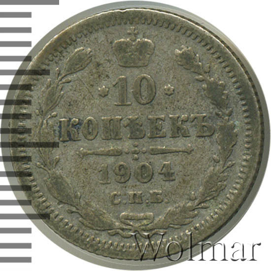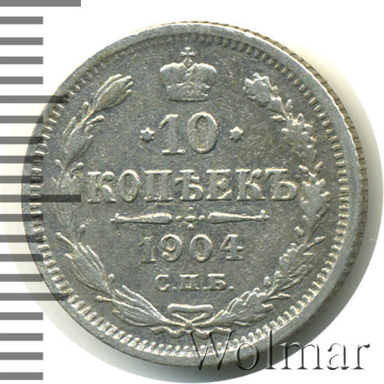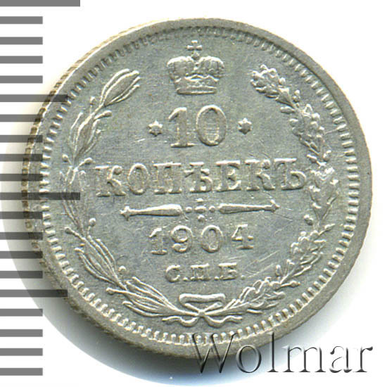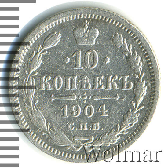 В центре указан номинал «10», ограниченный с обеих сторон звездочками. Над цифрой – Корона Российской империи. Под цифрой номинала — слово "КОПЕЕК". Ниже, расположен декоративный разделитель в виде двух разнонаправленных фигурных линий и стилизованным из точек крестом между ними. Под разделителем — дата выпуска монеты «1904». Под цифрой даты — обозначение монетного двора «С.П.Б.». Вдоль канта, не доходя до короны, изображен венок из лавровой и дубовой ветви, которые в нижней части перевязаны лентой на узел бантом. По окружности канта имеются рельефные элементы, выполненные в виде зубцов.