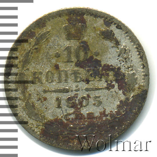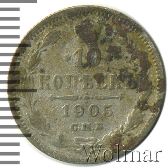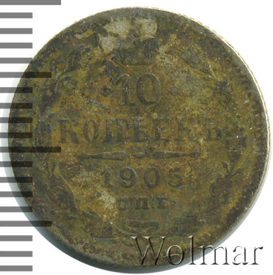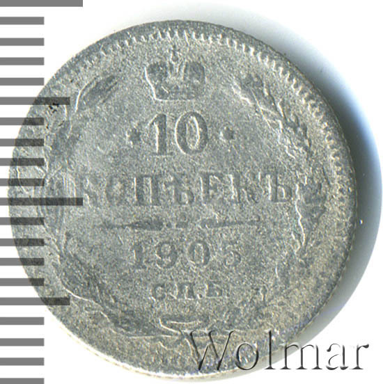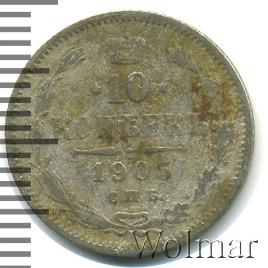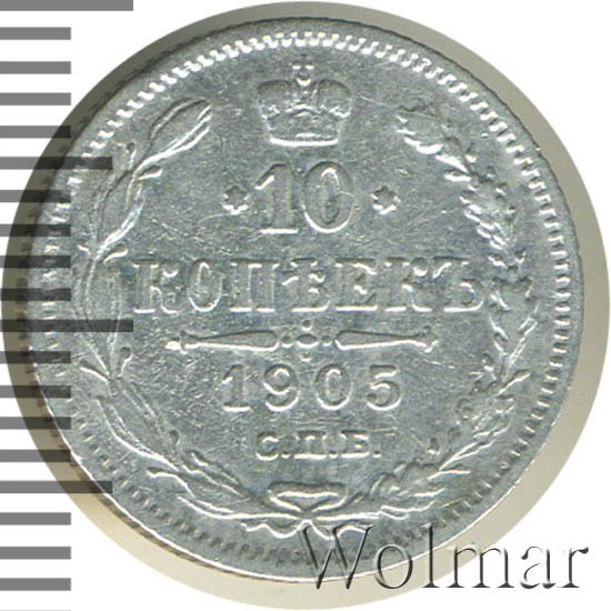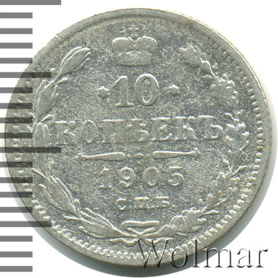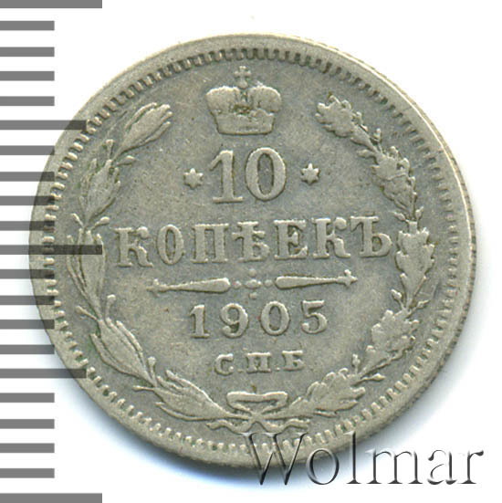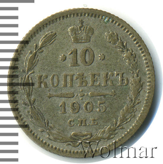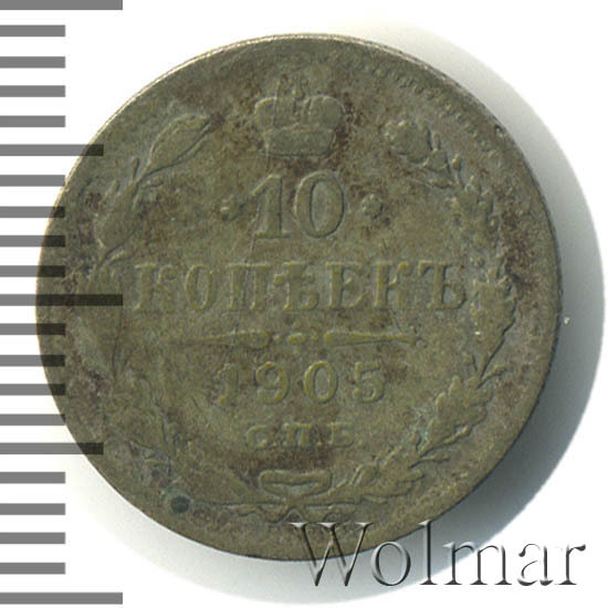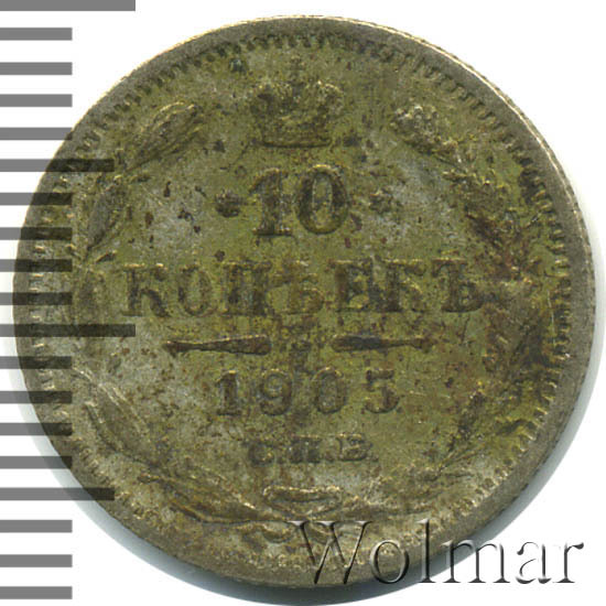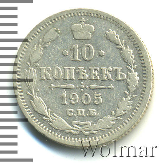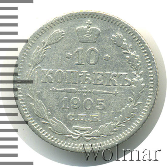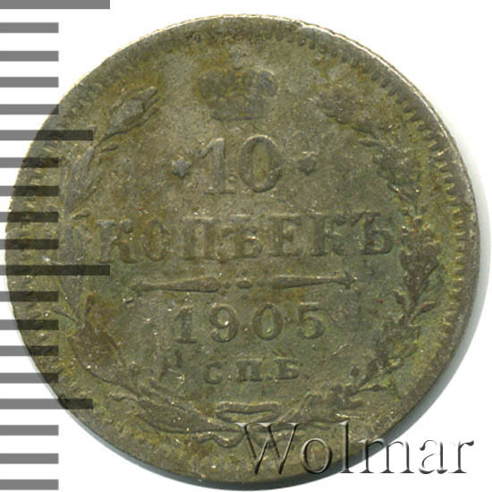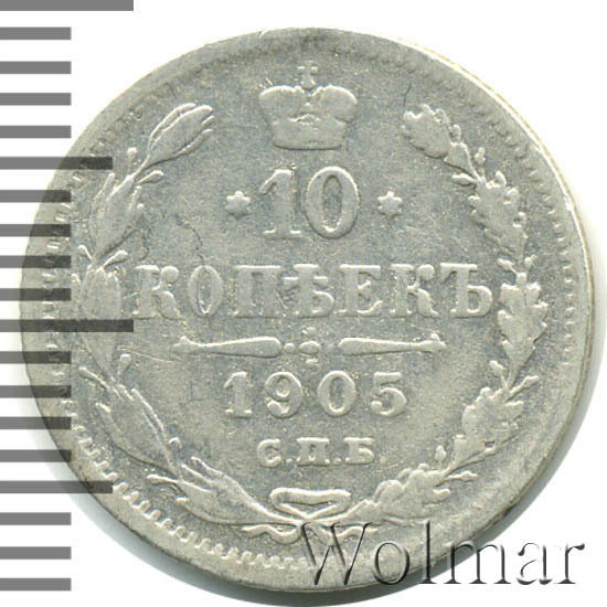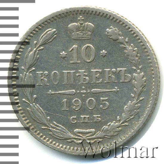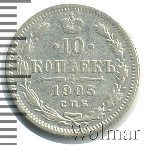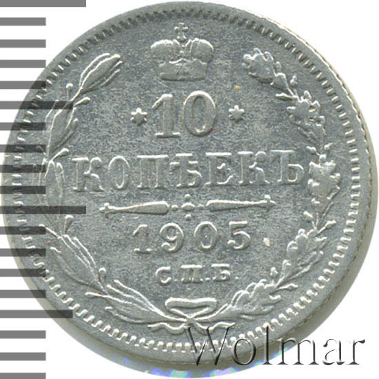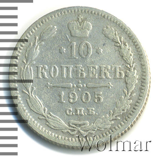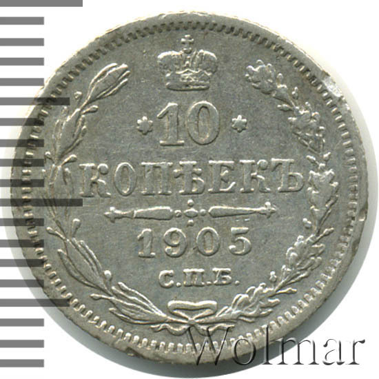 В центре указан номинал «10», ограниченный с обеих сторон звездочками. Над цифрой – Корона Российской империи. Под цифрой номинала — слово "КОПЕЕК". Ниже, расположен декоративный разделитель в виде двух разнонаправленных фигурных линий и стилизованным из точек крестом между ними. Под разделителем — дата выпуска монеты «1905». Под цифрой даты — обозначение монетного двора «С.П.Б.». Вдоль канта, не доходя до короны, изображен венок из лавровой и дубовой ветви, которые в нижней части перевязаны лентой на узел бантом. По окружности канта имеются рельефные элементы, выполненные в виде зубцов.