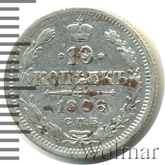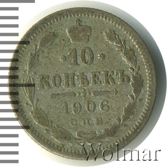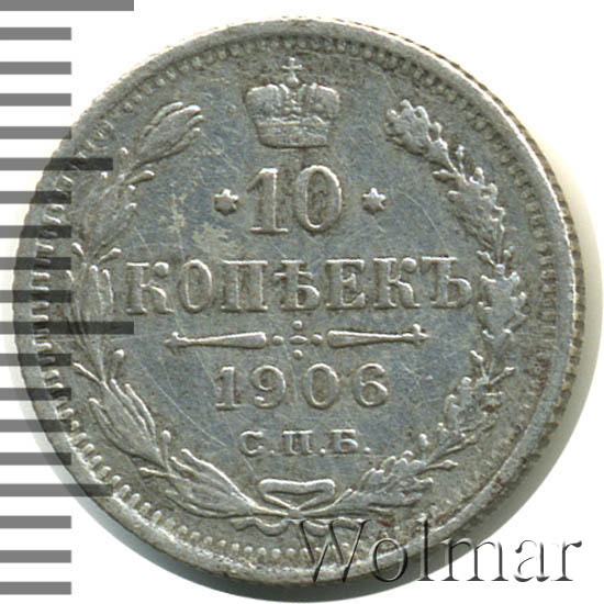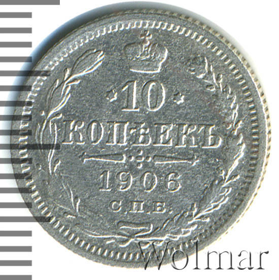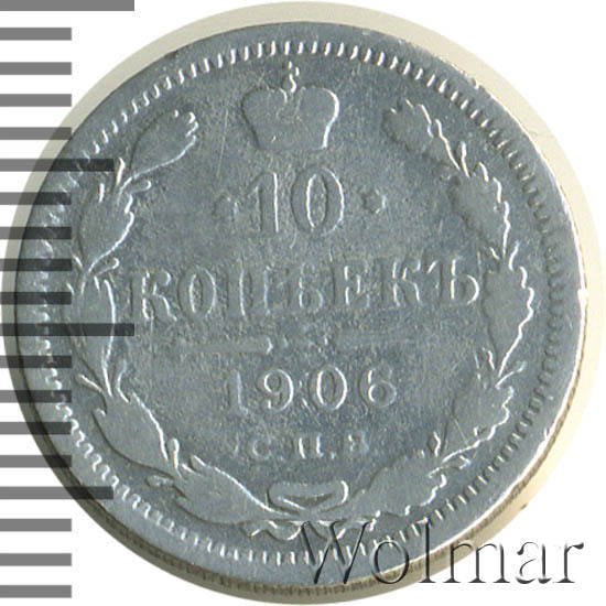 В центре указан номинал «10», ограниченный с обеих сторон звездочками. Над цифрой – Корона Российской империи. Под цифрой номинала — слово "КОПЕЕК". Ниже, расположен декоративный разделитель в виде двух разнонаправленных фигурных линий и стилизованным из точек крестом между ними. Под разделителем — дата выпуска монеты «1906». Под цифрой даты — обозначение монетного двора «С.П.Б.». Вдоль канта, не доходя до короны, изображен венок из лавровой и дубовой ветви, которые в нижней части перевязаны лентой на узел бантом. По окружности канта имеются рельефные элементы, выполненные в виде зубцов.