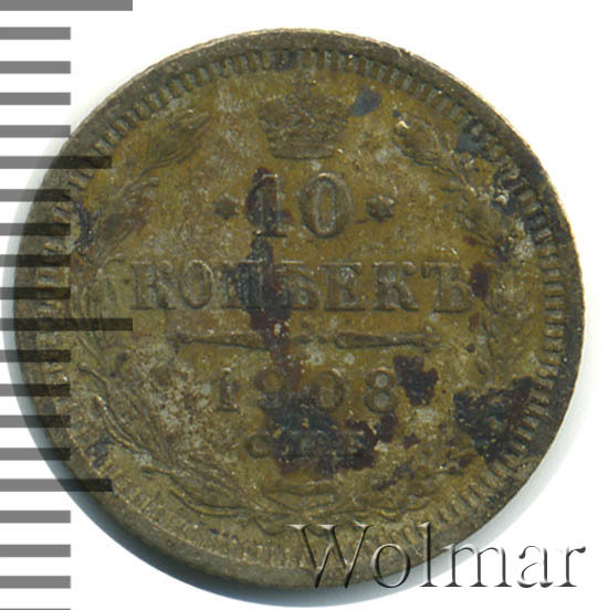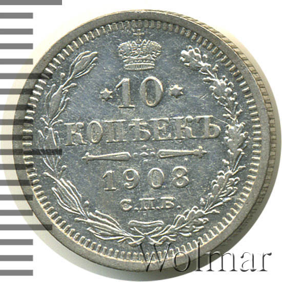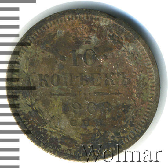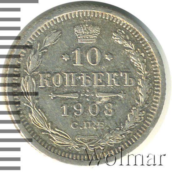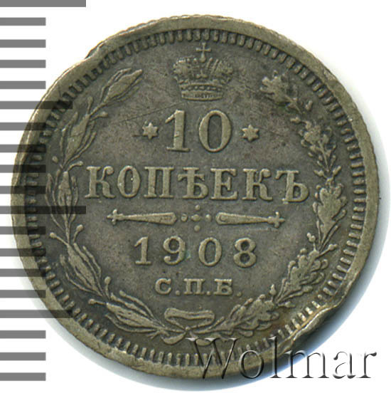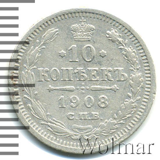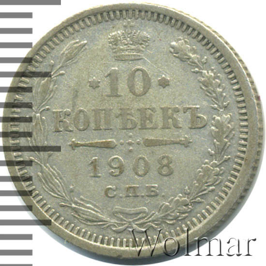 В центре указан номинал «10», ограниченный с обеих сторон звездочками. Над цифрой – Корона Российской империи. Под цифрой номинала — слово "КОПЕЕК". Ниже, расположен декоративный разделитель в виде двух разнонаправленных фигурных линий и стилизованным из точек крестом между ними. Под разделителем — дата выпуска монеты «1908». Под цифрой даты — обозначение монетного двора «С.П.Б.». Вдоль канта, не доходя до короны, изображен венок из лавровой и дубовой ветви, которые в нижней части перевязаны лентой на узел бантом. По окружности канта имеются рельефные элементы, выполненные в виде зубцов.