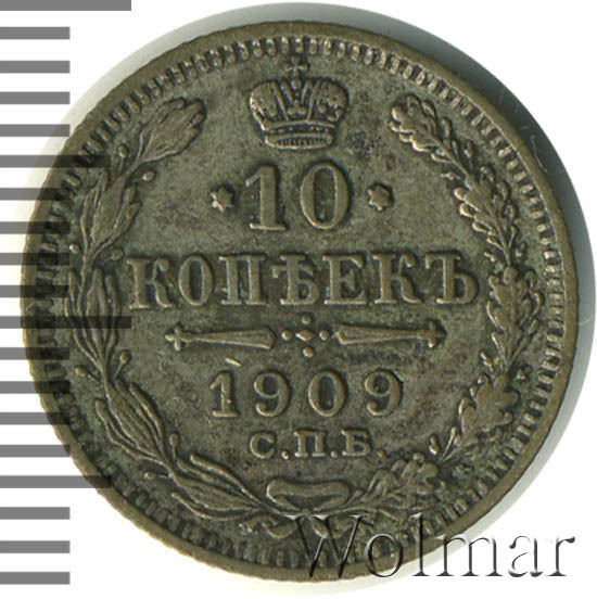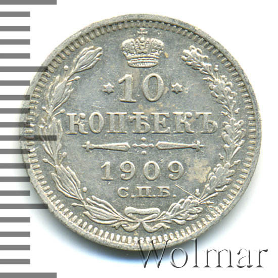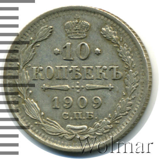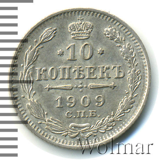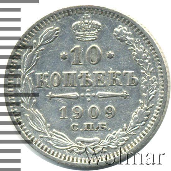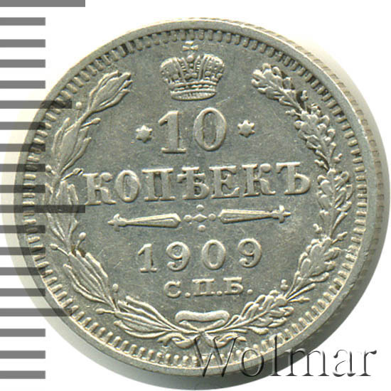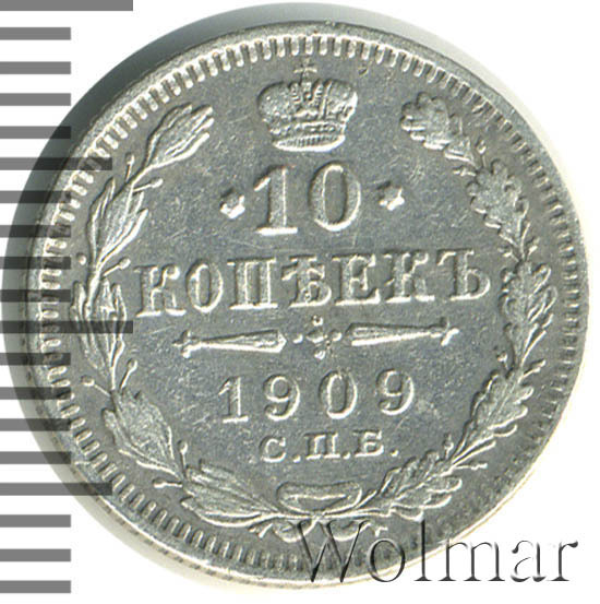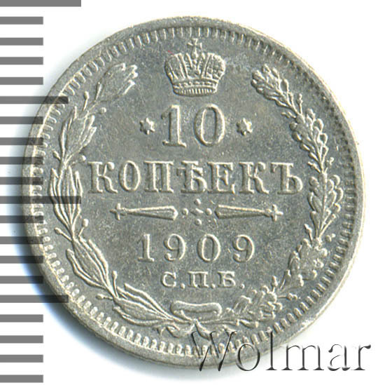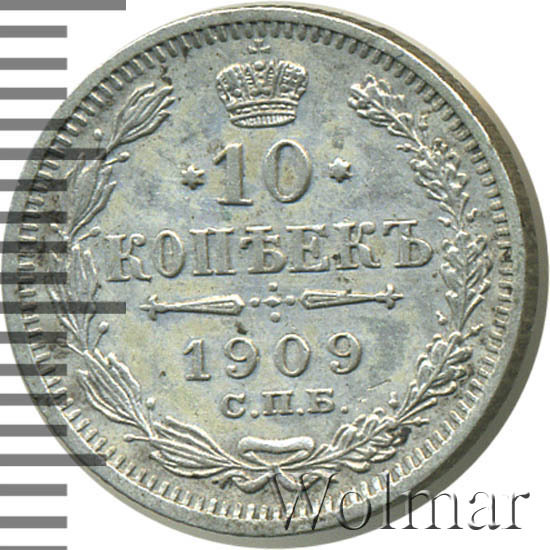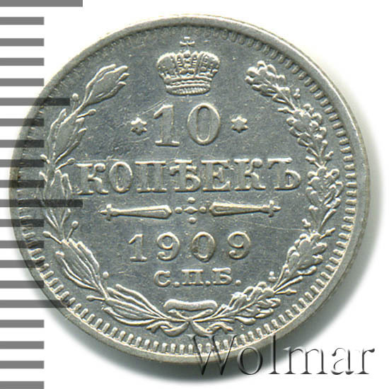 В центре указан номинал «10», ограниченный с обеих сторон звездочками. Над цифрой – Корона Российской империи. Под цифрой номинала — слово "КОПЕЕК". Ниже, расположен декоративный разделитель в виде двух разнонаправленных фигурных линий и стилизованным из точек крестом между ними. Под разделителем — дата выпуска монеты «1909». Под цифрой даты — обозначение монетного двора «С.П.Б.». Вдоль канта, не доходя до короны, изображен венок из лавровой и дубовой ветви, которые в нижней части перевязаны лентой на узел бантом. По окружности канта имеются рельефные элементы, выполненные в виде зубцов.