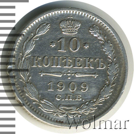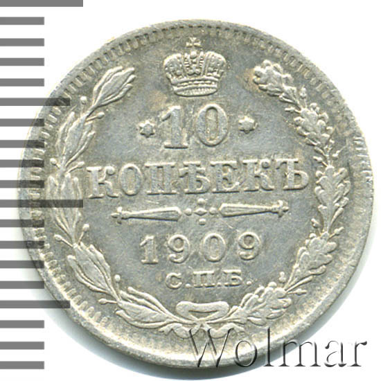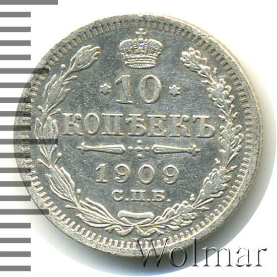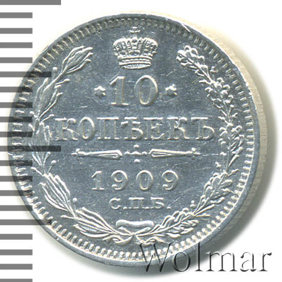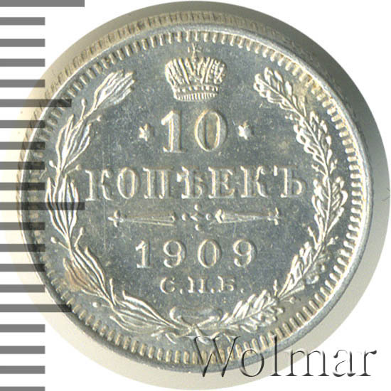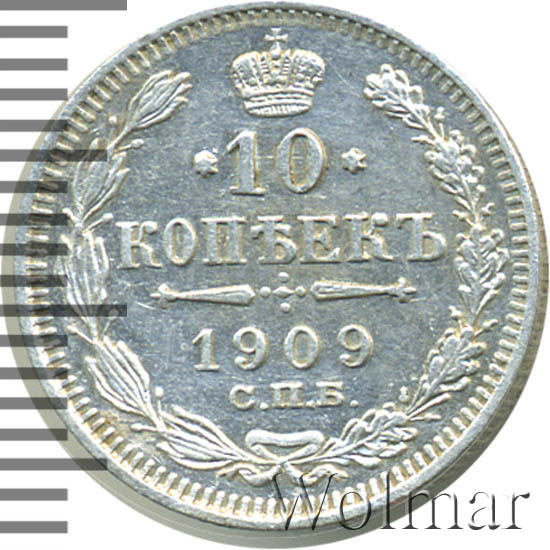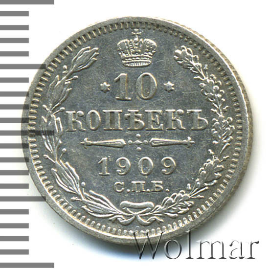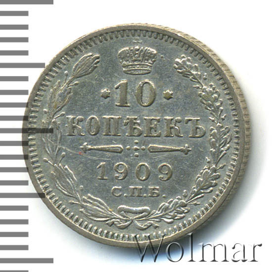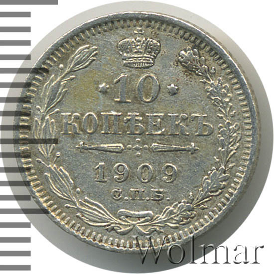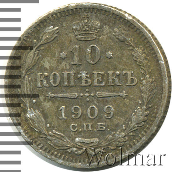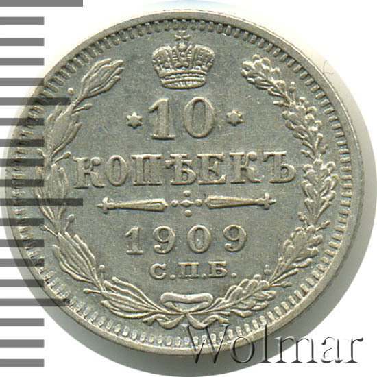 В центре указан номинал «10», ограниченный с обеих сторон звездочками. Над цифрой – Корона Российской империи. Под цифрой номинала — слово "КОПЕЕК". Ниже, расположен декоративный разделитель в виде двух разнонаправленных фигурных линий и стилизованным из точек крестом между ними. Под разделителем — дата выпуска монеты «1909». Под цифрой даты — обозначение монетного двора «С.П.Б.». Вдоль канта, не доходя до короны, изображен венок из лавровой и дубовой ветви, которые в нижней части перевязаны лентой на узел бантом. По окружности канта имеются рельефные элементы, выполненные в виде зубцов.