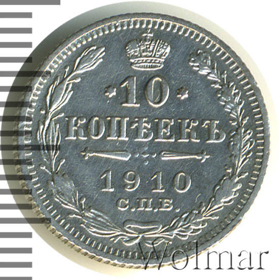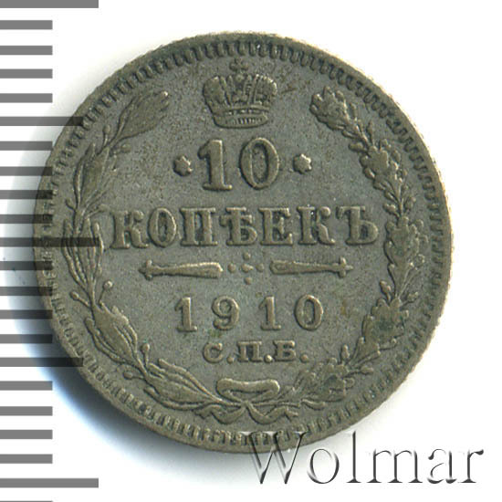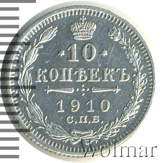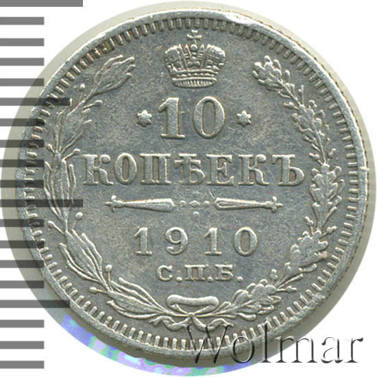 В центре указан номинал «10», ограниченный с обеих сторон звездочками. Над цифрой – Корона Российской империи. Под цифрой номинала — слово "КОПЕЕК". Ниже, расположен декоративный разделитель в виде двух разнонаправленных фигурных линий и стилизованным из точек крестом между ними. Под разделителем — дата выпуска монеты «1910». Под цифрой даты — обозначение монетного двора «С.П.Б.». Вдоль канта, не доходя до короны, изображен венок из лавровой и дубовой ветви, которые в нижней части перевязаны лентой на узел бантом. По окружности канта имеются рельефные элементы, выполненные в виде зубцов.