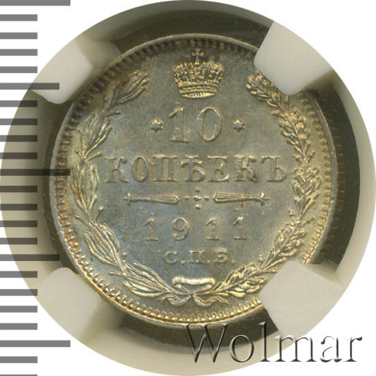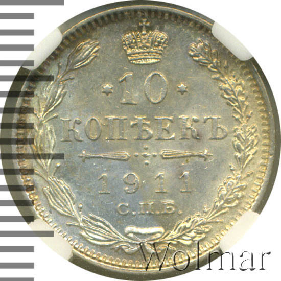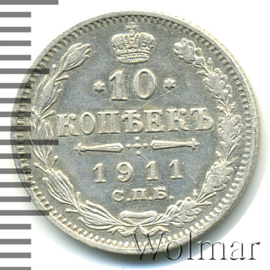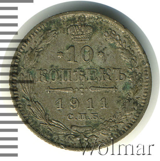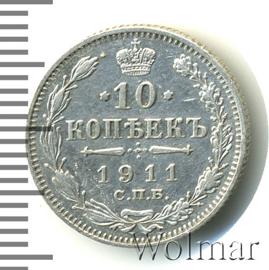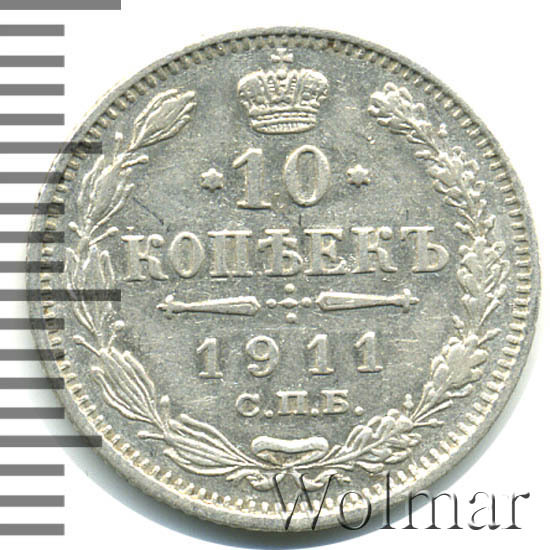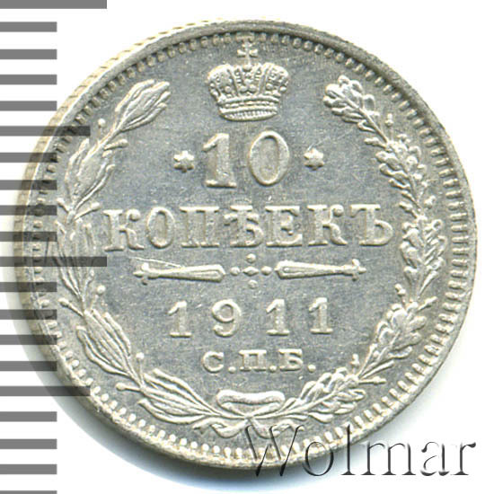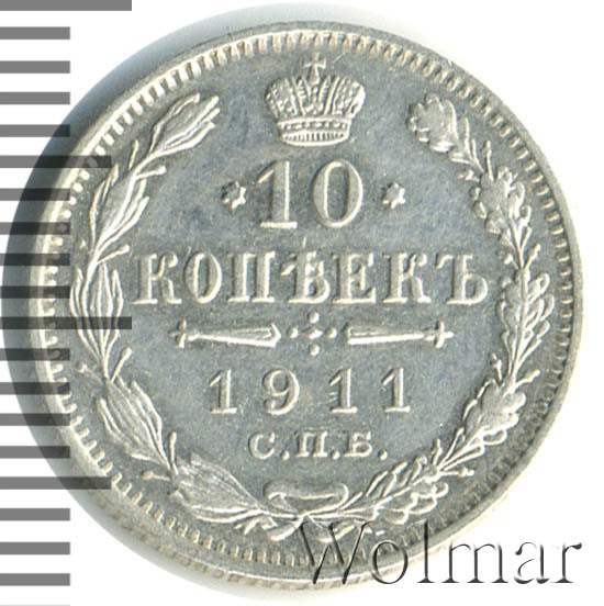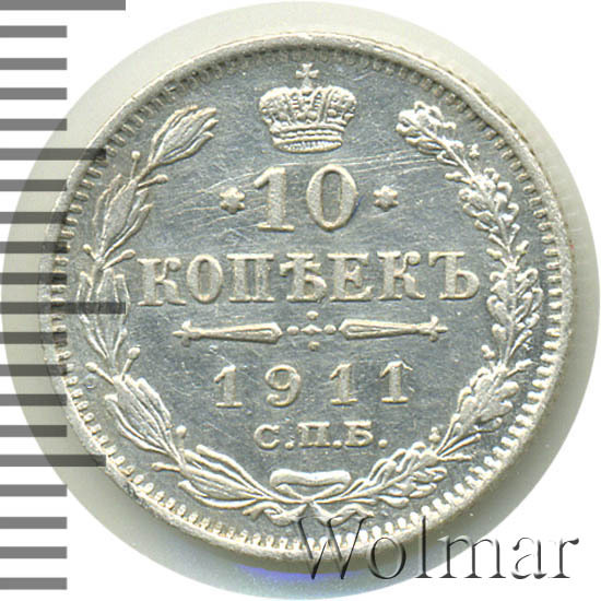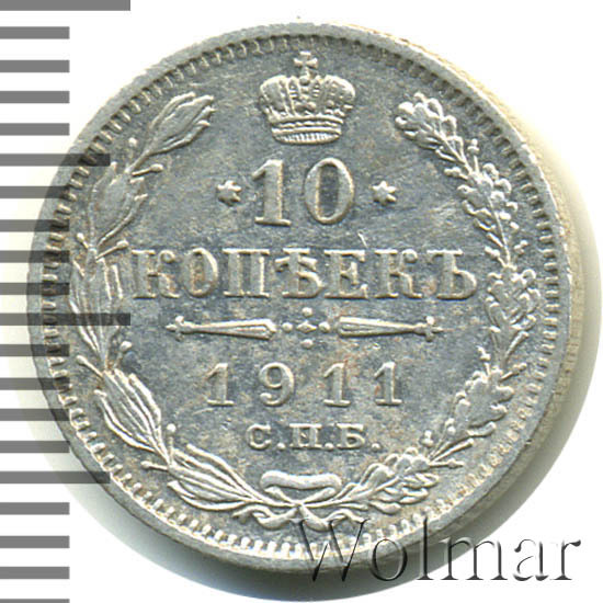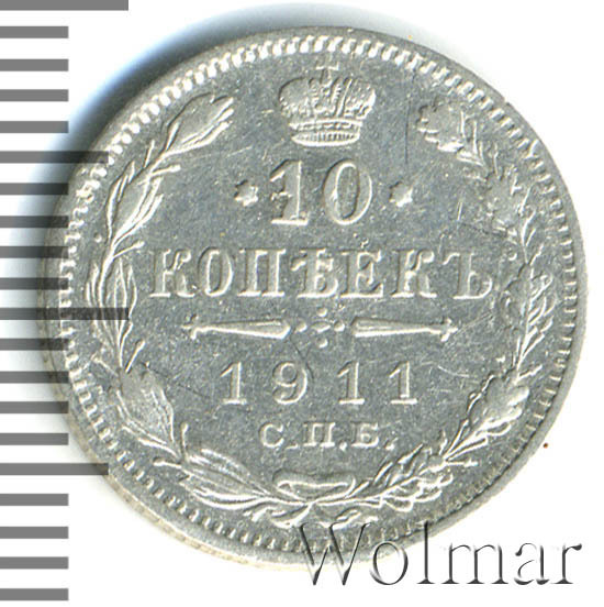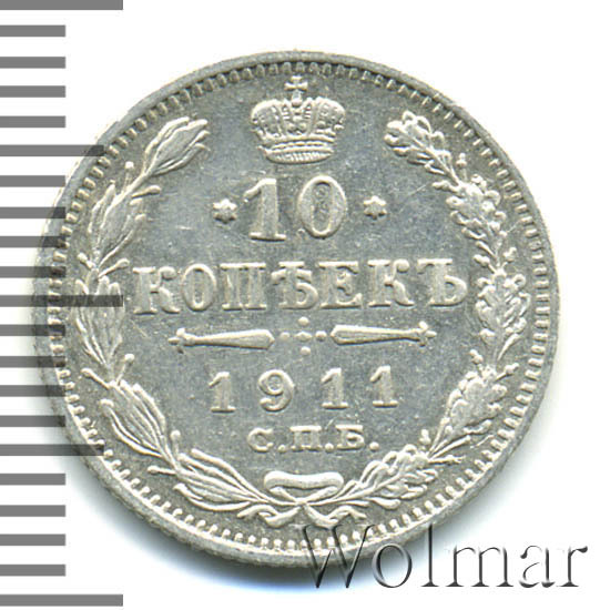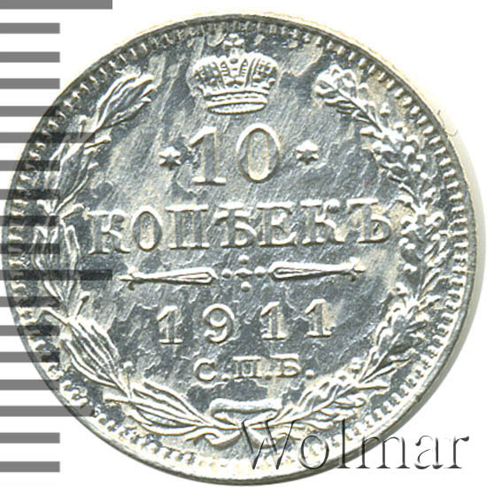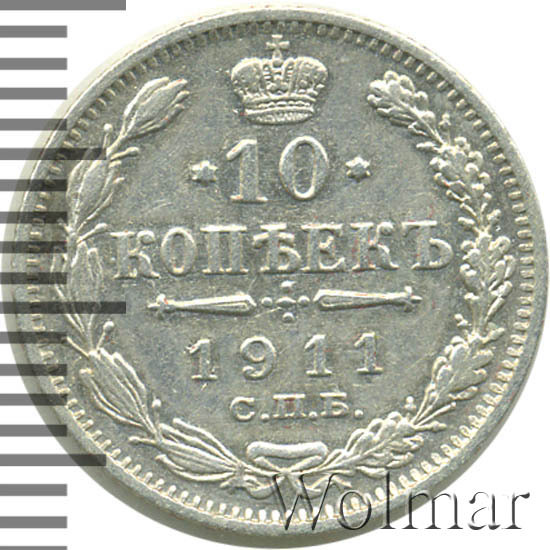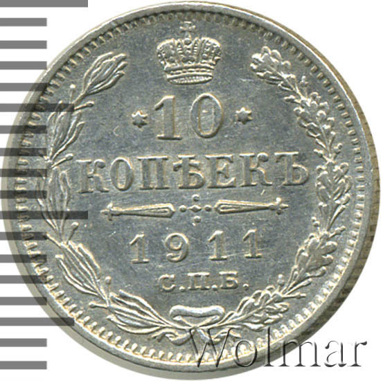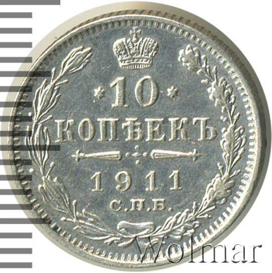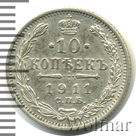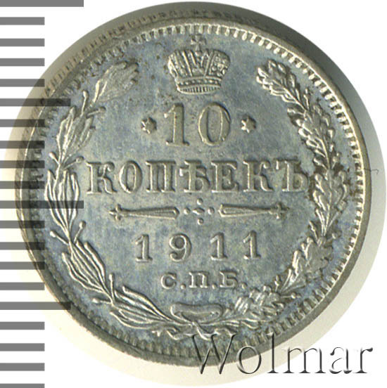 В центре указан номинал «10», ограниченный с обеих сторон звездочками. Над цифрой – Корона Российской империи. Под цифрой номинала — слово "КОПЕЕК". Ниже, расположен декоративный разделитель в виде двух разнонаправленных фигурных линий и стилизованным из точек крестом между ними. Под разделителем — дата выпуска монеты «1911». Под цифрой даты — обозначение монетного двора «С.П.Б.». Вдоль канта, не доходя до короны, изображен венок из лавровой и дубовой ветви, которые в нижней части перевязаны лентой на узел бантом. По окружности канта имеются рельефные элементы, выполненные в виде зубцов.