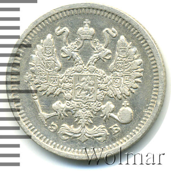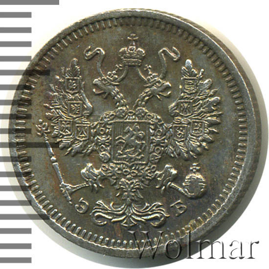 В центре изображен Малый Государственный Герб Российской империи - двуглавый орёл, головы которого увенчаны двумя коронами, третья, большая корона над ними. Все они соединены орденской лентой ордена Св. Апостола Андрея Первозванного. На груди орла расположен Московский герб, в щите изображен Георгий Победоносец с копьем поражающий дракона. Вокруг щита цепь ордена Св. Апостола Андрея Первозванного. На крыльях изображены гербы: Царства Казанского, Польского, Херсонеса Таврического, Астраханского, Сибирского, Грузинского и герб соединенных княжеств Киевского, Новгородского и Владимирского — по 4 на каждое крыло. В правой лапе орла – скипетр, в левой – держава. Под правой лапой – буква «Э», под левой – буква «Б». Инициалы минцмейстера Эликума Бабаянца. По окружности канта имеются рельефные элементы, выполненные в виде зубцов.