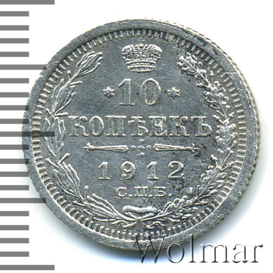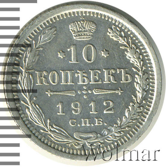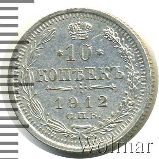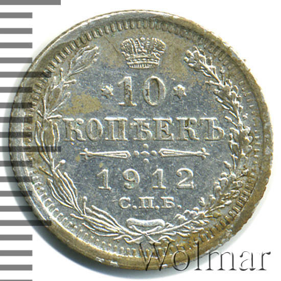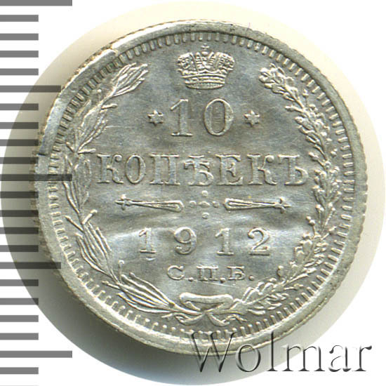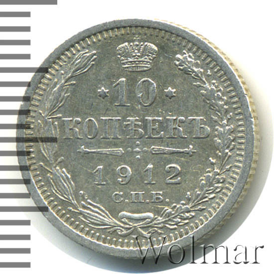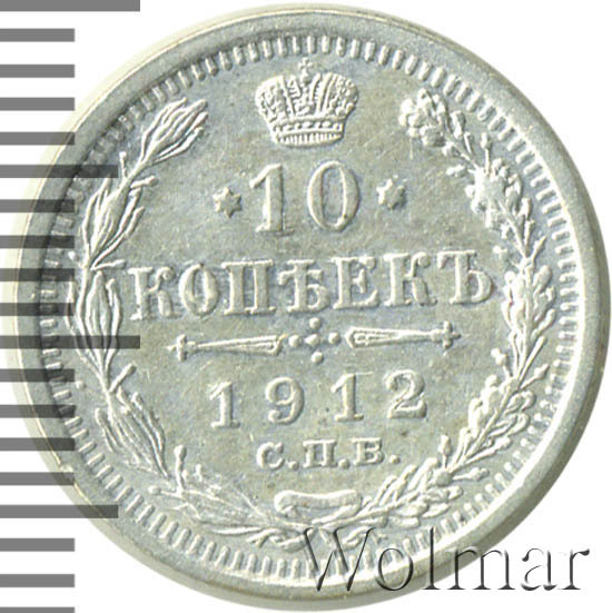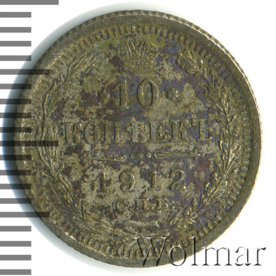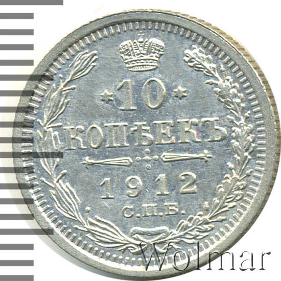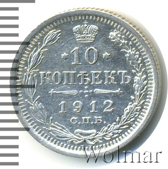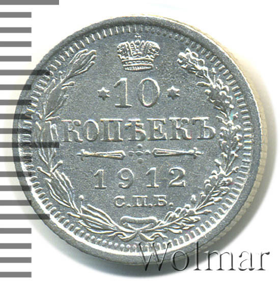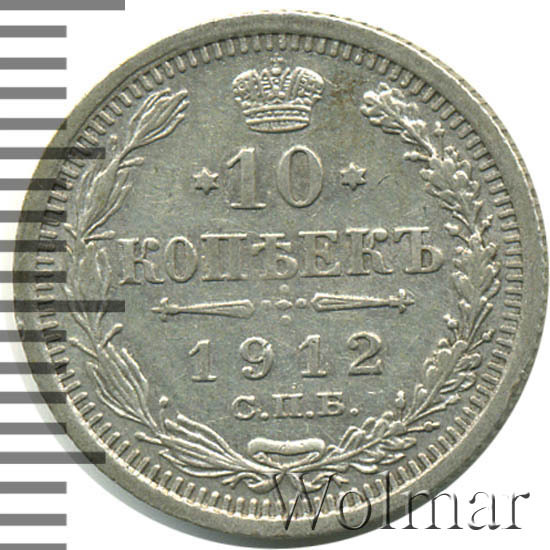 В центре указан номинал «10», ограниченный с обеих сторон звездочками. Над цифрой – Корона Российской империи. Под цифрой номинала — слово "КОПЕЕК". Ниже, расположен декоративный разделитель в виде двух разнонаправленных фигурных линий и стилизованным из точек крестом между ними. Под разделителем — дата выпуска монеты «1912». Под цифрой даты — обозначение монетного двора «С.П.Б.». Вдоль канта, не доходя до короны, изображен венок из лавровой и дубовой ветви, которые в нижней части перевязаны лентой на узел бантом. По окружности канта имеются рельефные элементы, выполненные в виде зубцов.