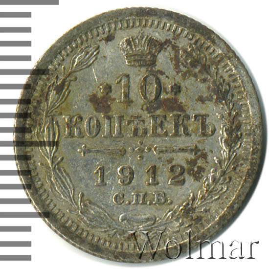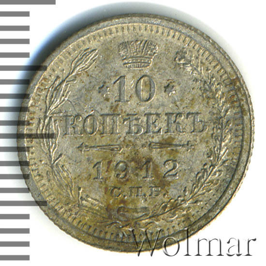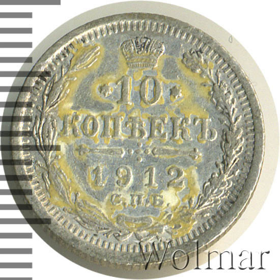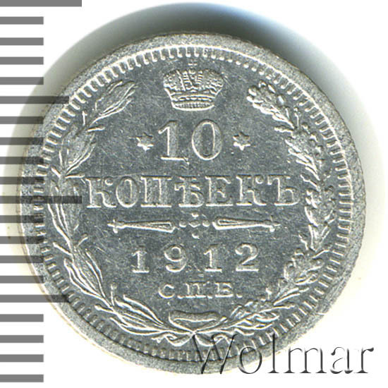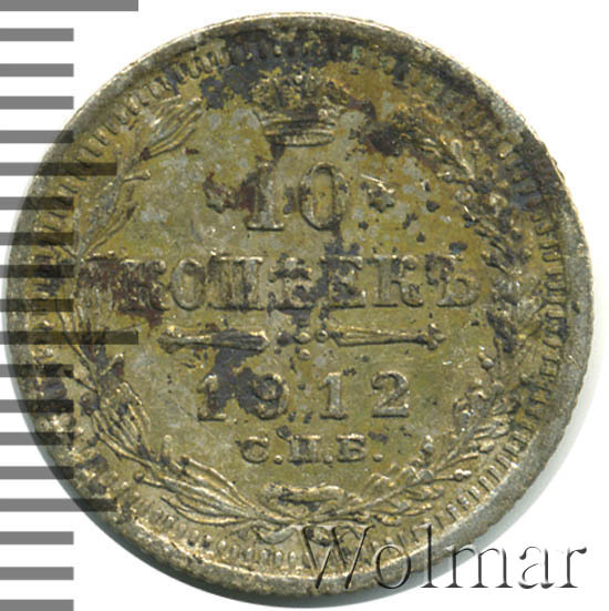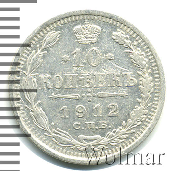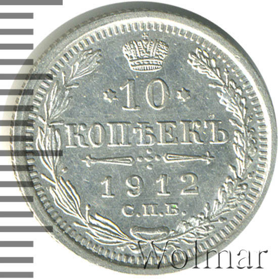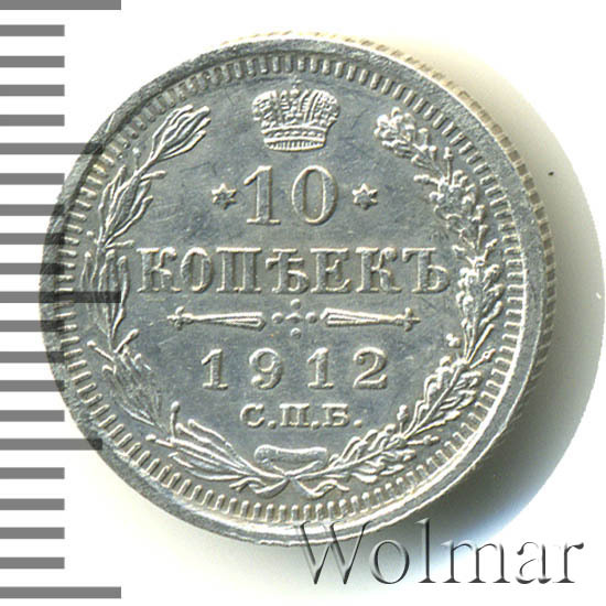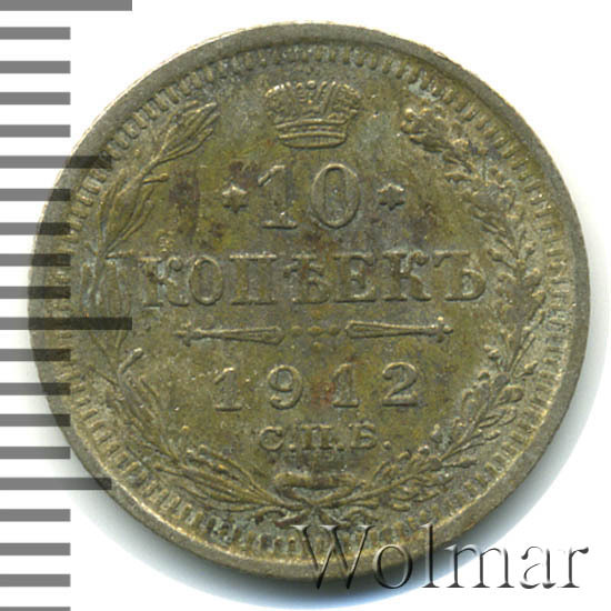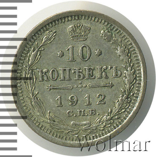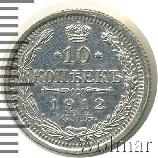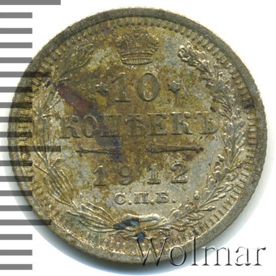 В центре указан номинал «10», ограниченный с обеих сторон звездочками. Над цифрой – Корона Российской империи. Под цифрой номинала — слово "КОПЕЕК". Ниже, расположен декоративный разделитель в виде двух разнонаправленных фигурных линий и стилизованным из точек крестом между ними. Под разделителем — дата выпуска монеты «1912». Под цифрой даты — обозначение монетного двора «С.П.Б.». Вдоль канта, не доходя до короны, изображен венок из лавровой и дубовой ветви, которые в нижней части перевязаны лентой на узел бантом. По окружности канта имеются рельефные элементы, выполненные в виде зубцов.