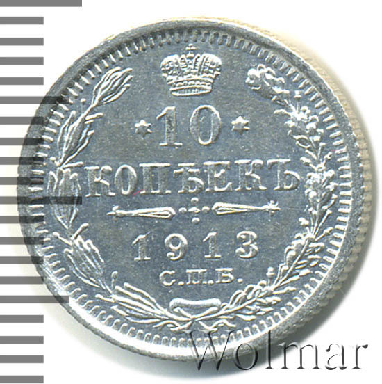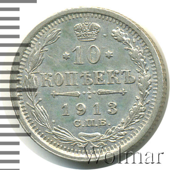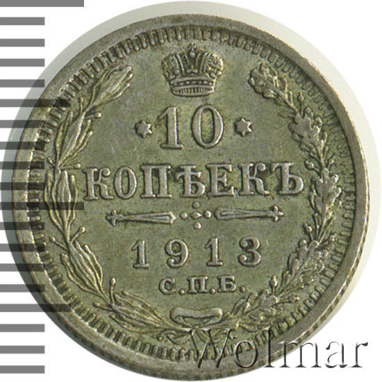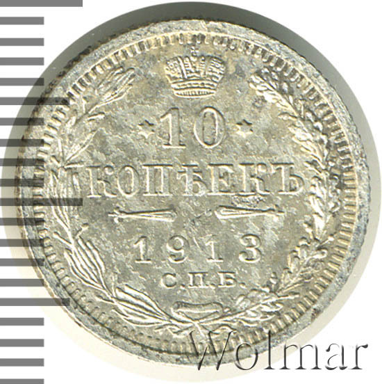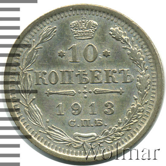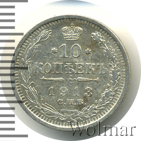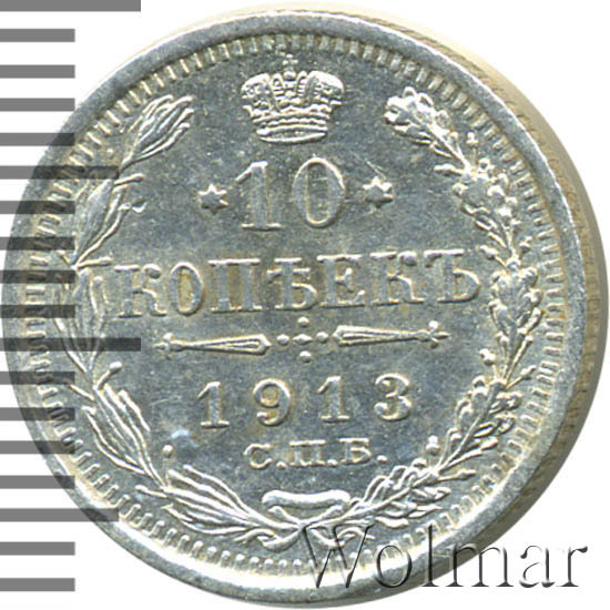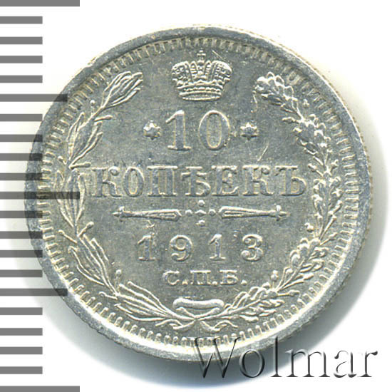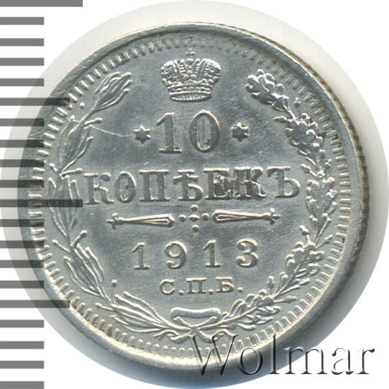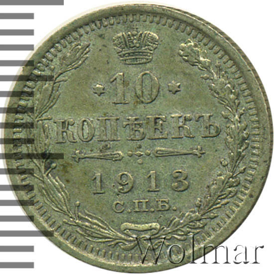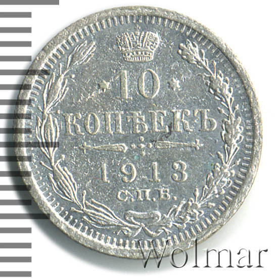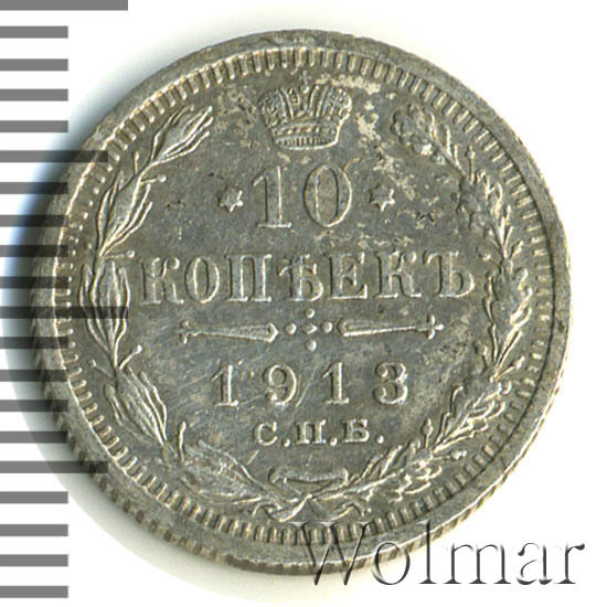 В центре указан номинал «10», ограниченный с обеих сторон звездочками. Над цифрой – Корона Российской империи. Под цифрой номинала — слово "КОПЕЕК". Ниже, расположен декоративный разделитель в виде двух разнонаправленных фигурных линий и стилизованным из точек крестом между ними. Под разделителем — дата выпуска монеты «1913». Под цифрой даты — обозначение монетного двора «С.П.Б.». Вдоль канта, не доходя до короны, изображен венок из лавровой и дубовой ветви, которые в нижней части перевязаны лентой на узел бантом. По окружности канта имеются рельефные элементы, выполненные в виде зубцов.