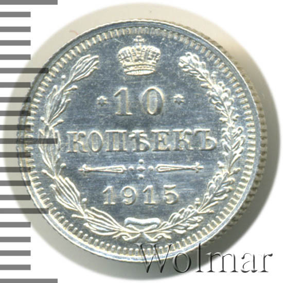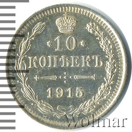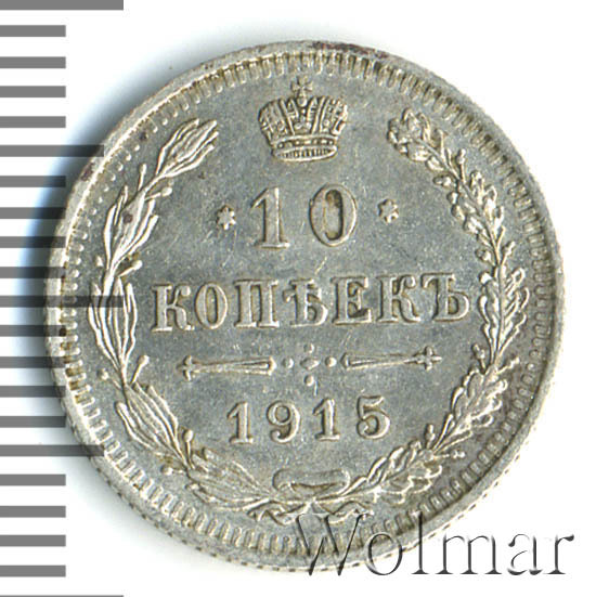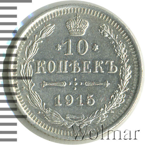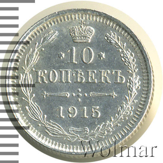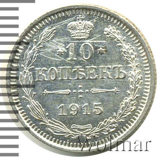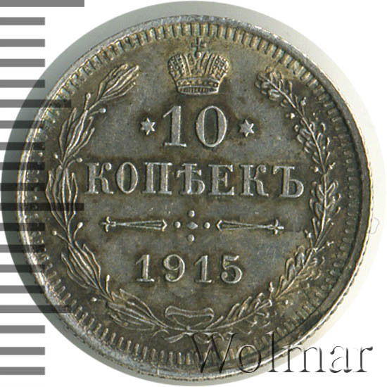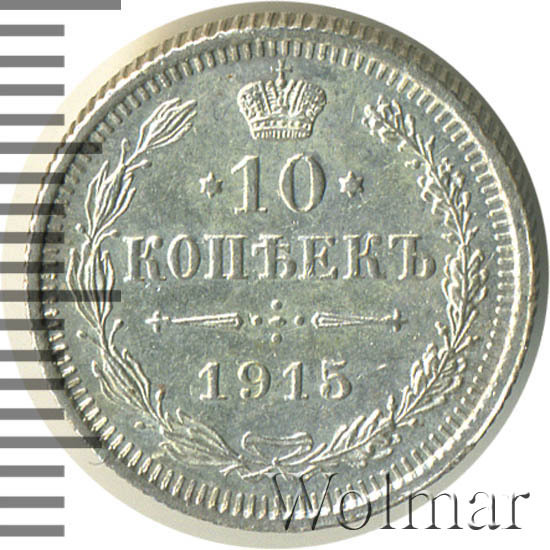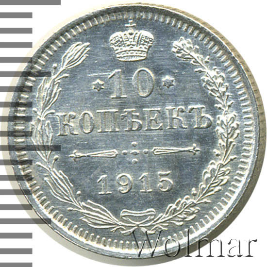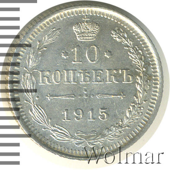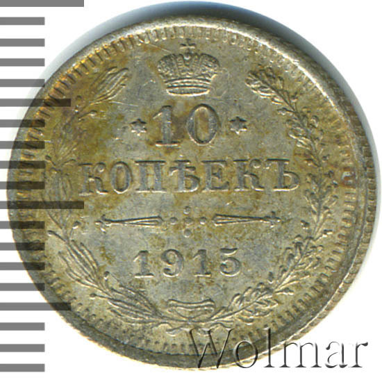 В центре указан номинал «10», ограниченный с обеих сторон звездочками. Над цифрой – Корона Российской империи. Под цифрой номинала — слово "КОПЕЕК". Ниже, расположен декоративный разделитель в виде двух разнонаправленных фигурных линий и стилизованным из точек крестом между ними. Под разделителем — дата выпуска монеты «1915». Вдоль канта, не доходя до короны, изображен венок из лавровой и дубовой ветви, которые в нижней части перевязаны лентой на узел бантом. По окружности канта имеются рельефные элементы, выполненные в виде зубцов.