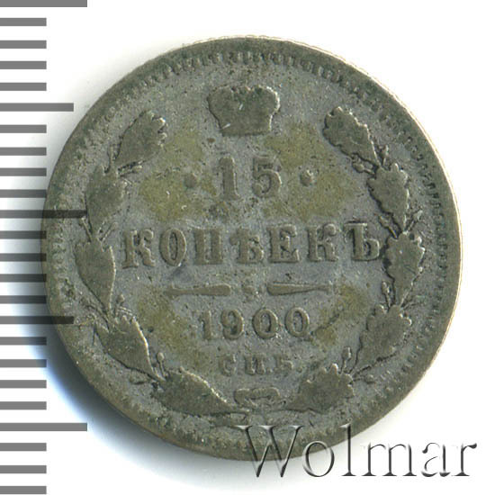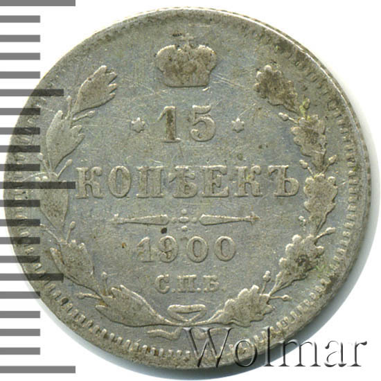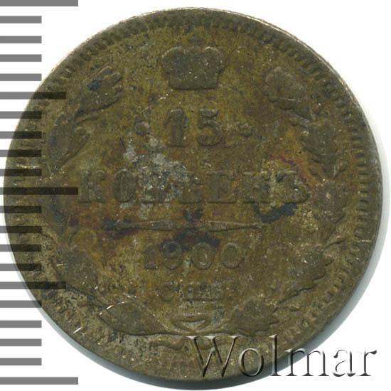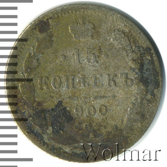 В центре указан номинал «15», ограниченный с обеих сторон звездочками. Над цифрой – Корона Российской империи. Под цифрой номинала — слово "КОПЕЕК". Ниже, расположен декоративный разделитель в виде двух разнонаправленных фигурных линий и стилизованным из точек крестом между ними. Под разделителем — дата выпуска монеты «1900». Под цифрой даты — обозначение монетного двора «С.П.Б.». Вдоль канта, не доходя до короны, изображен венок из лавровой и дубовой ветви, которые в нижней части перевязаны лентой на узел бантом. По окружности канта имеются рельефные элементы, выполненные в виде зубцов.