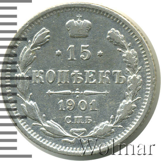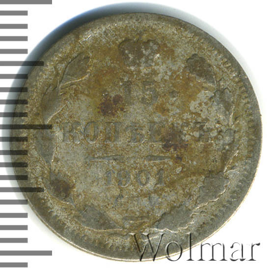 В центре указан номинал «15», ограниченный с обеих сторон звездочками. Над цифрой – Корона Российской империи. Под цифрой номинала — слово "КОПЕЕК". Ниже, расположен декоративный разделитель в виде двух разнонаправленных фигурных линий и стилизованным из точек крестом между ними. Под разделителем — дата выпуска монеты «1901». Под цифрой даты — обозначение монетного двора «С.П.Б.». Вдоль канта, не доходя до короны, изображен венок из лавровой и дубовой ветви, которые в нижней части перевязаны лентой на узел бантом. По окружности канта имеются рельефные элементы, выполненные в виде зубцов.