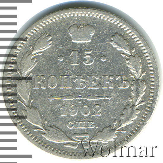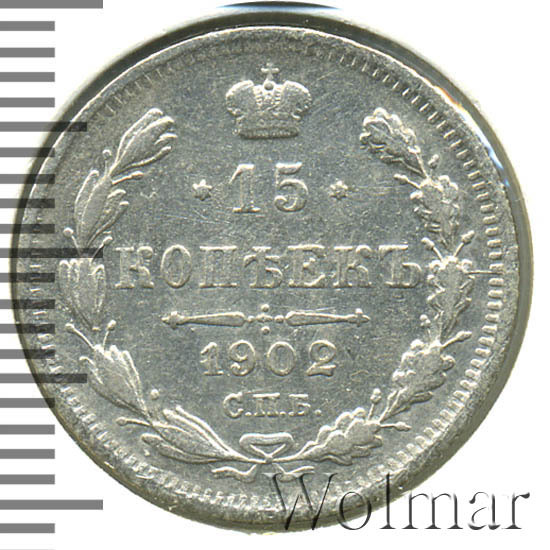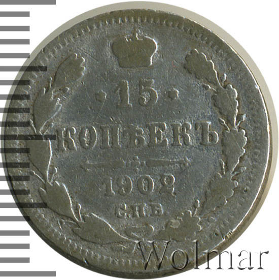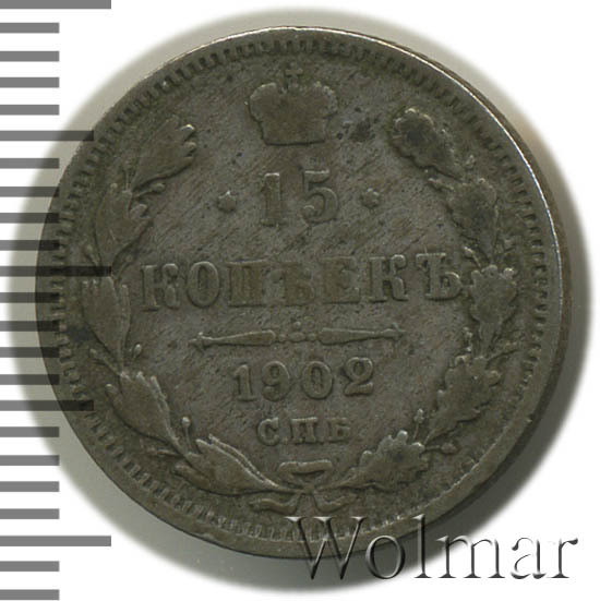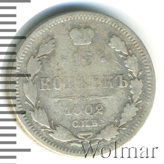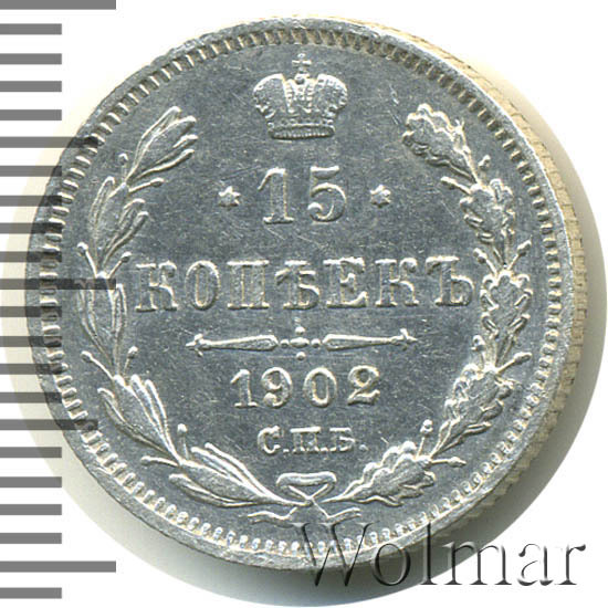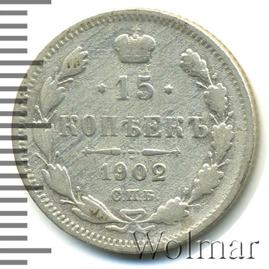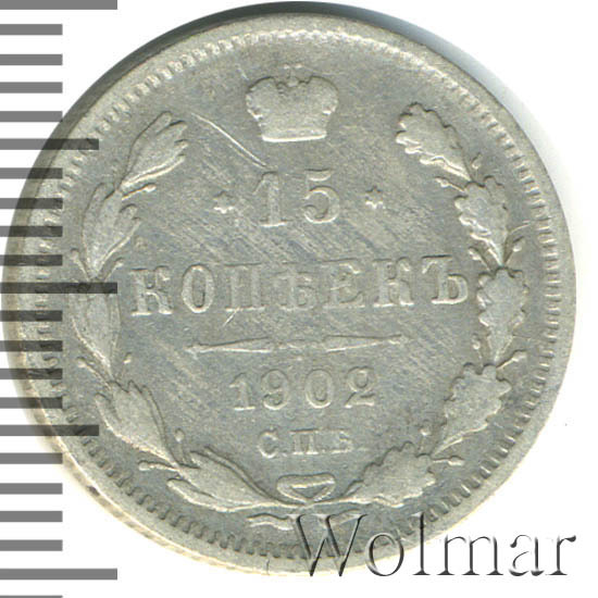 В центре указан номинал «15», ограниченный с обеих сторон звездочками. Над цифрой – Корона Российской империи. Под цифрой номинала — слово "КОПЕЕК". Ниже, расположен декоративный разделитель в виде двух разнонаправленных фигурных линий и стилизованным из точек крестом между ними. Под разделителем — дата выпуска монеты «1902». Под цифрой даты — обозначение монетного двора «С.П.Б.». Вдоль канта, не доходя до короны, изображен венок из лавровой и дубовой ветви, которые в нижней части перевязаны лентой на узел бантом. По окружности канта имеются рельефные элементы, выполненные в виде зубцов.