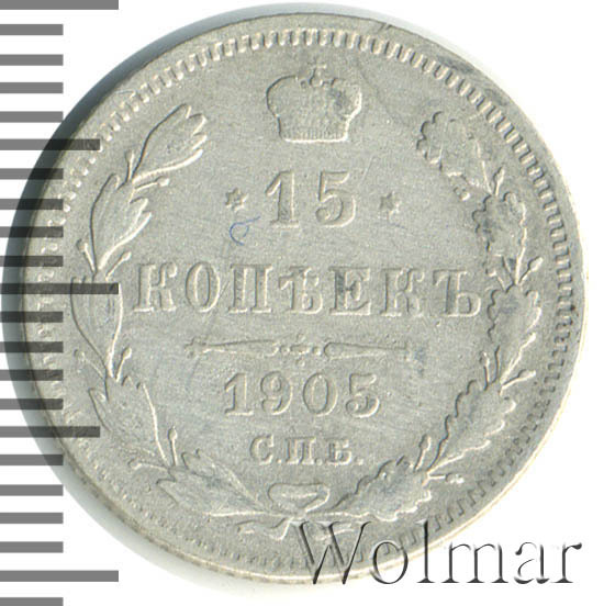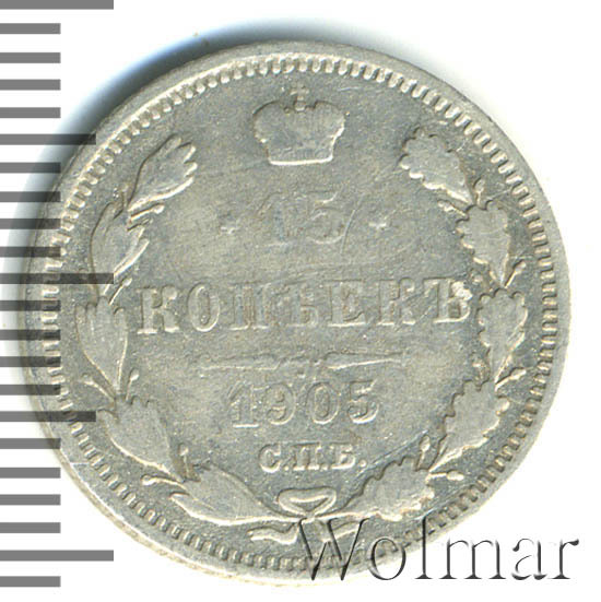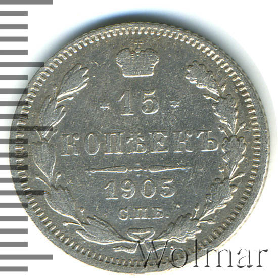 В центре указан номинал «15», ограниченный с обеих сторон звездочками. Над цифрой – Корона Российской империи. Под цифрой номинала — слово "КОПЕЕК". Ниже, расположен декоративный разделитель в виде двух разнонаправленных фигурных линий и стилизованным из точек крестом между ними. Под разделителем — дата выпуска монеты «1905». Под цифрой даты — обозначение монетного двора «С.П.Б.». Вдоль канта, не доходя до короны, изображен венок из лавровой и дубовой ветви, которые в нижней части перевязаны лентой на узел бантом. По окружности канта имеются рельефные элементы, выполненные в виде зубцов.