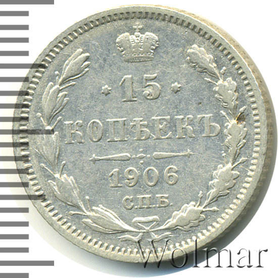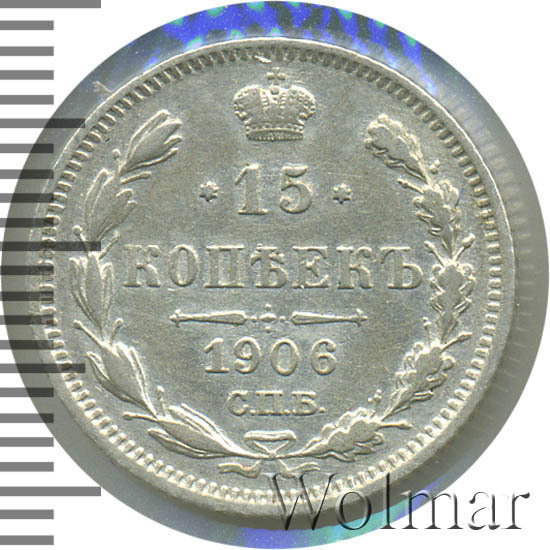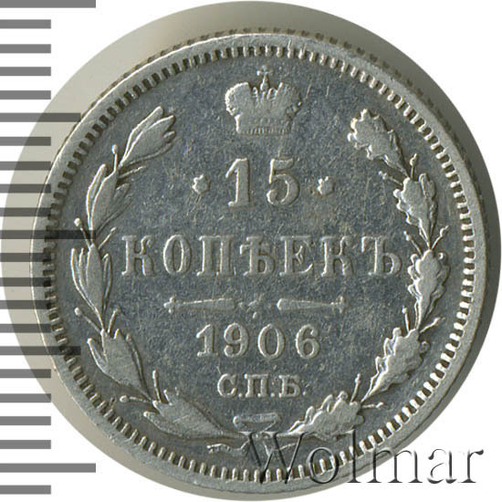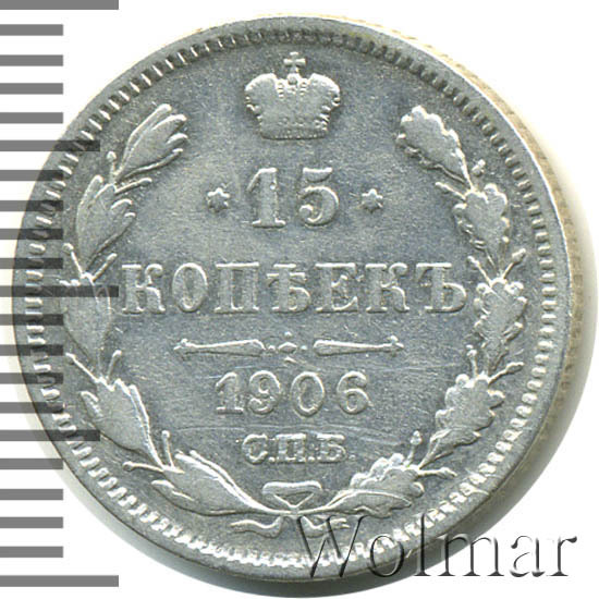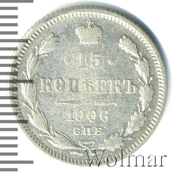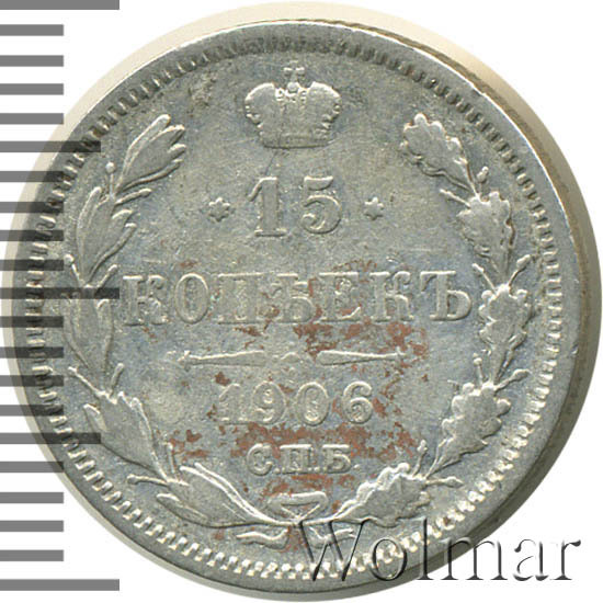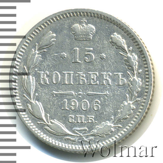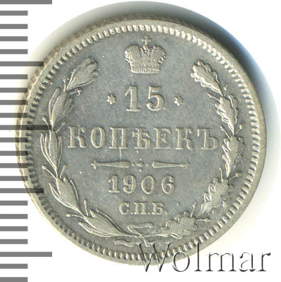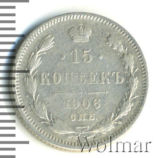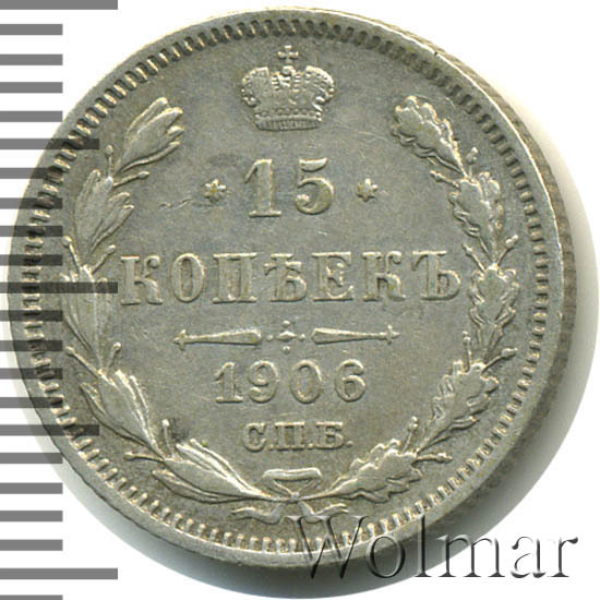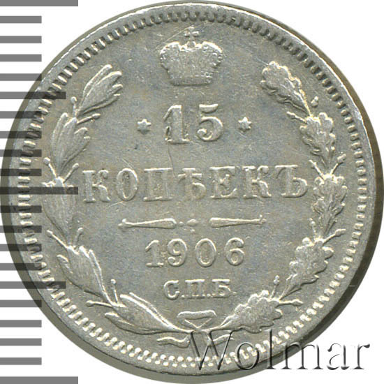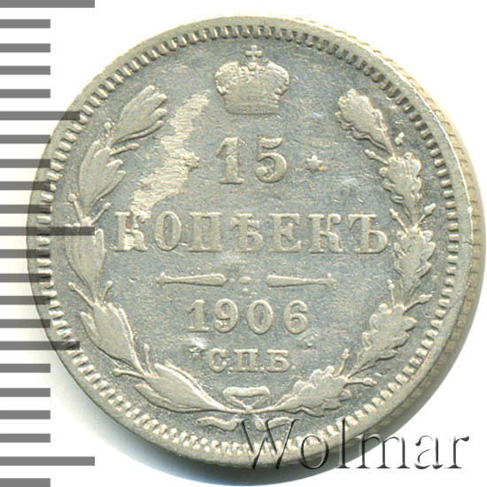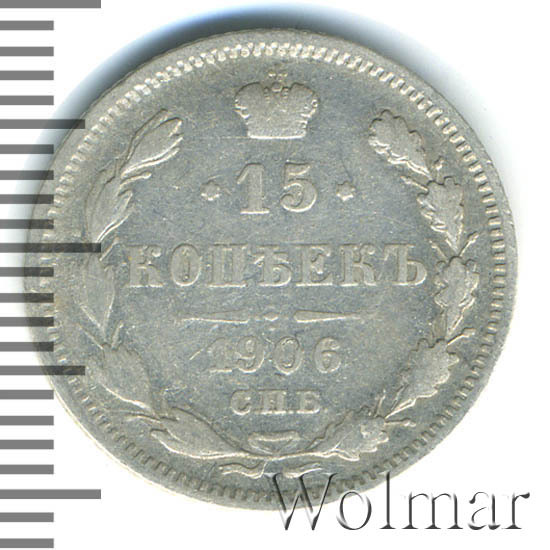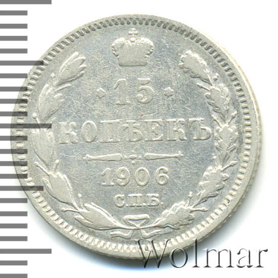 В центре указан номинал «15», ограниченный с обеих сторон звездочками. Над цифрой – Корона Российской империи. Под цифрой номинала — слово "КОПЕЕК". Ниже, расположен декоративный разделитель в виде двух разнонаправленных фигурных линий и стилизованным из точек крестом между ними. Под разделителем — дата выпуска монеты «1906». Под цифрой даты — обозначение монетного двора «С.П.Б.». Вдоль канта, не доходя до короны, изображен венок из лавровой и дубовой ветви, которые в нижней части перевязаны лентой на узел бантом. По окружности канта имеются рельефные элементы, выполненные в виде зубцов.