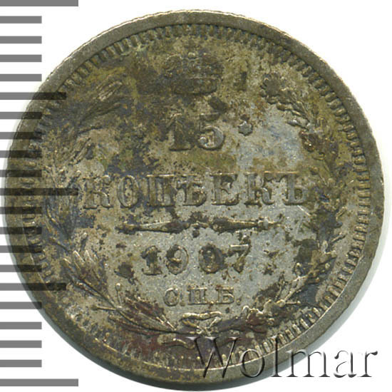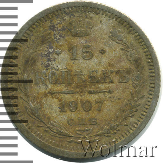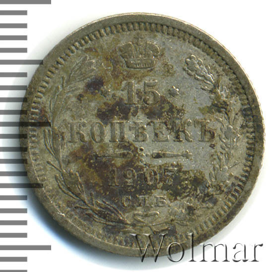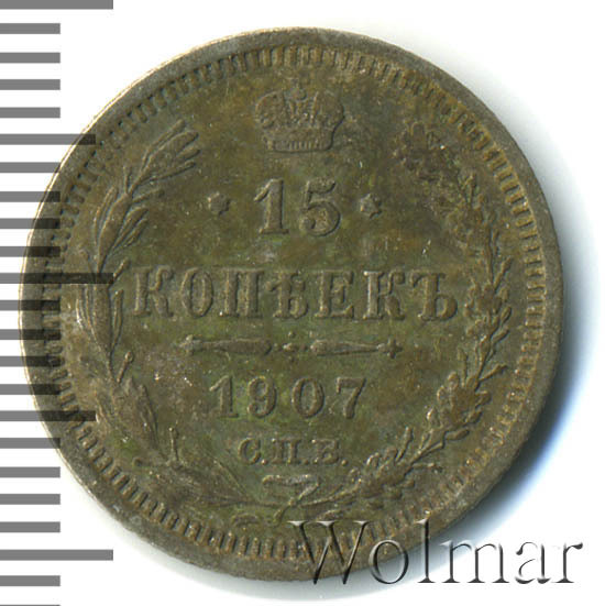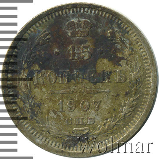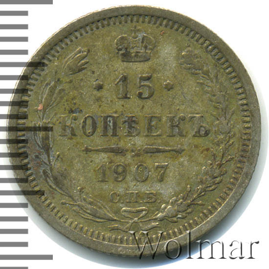 В центре указан номинал «15», ограниченный с обеих сторон звездочками. Над цифрой – Корона Российской империи. Под цифрой номинала — слово "КОПЕЕК". Ниже, расположен декоративный разделитель в виде двух разнонаправленных фигурных линий и стилизованным из точек крестом между ними. Под разделителем — дата выпуска монеты «1907». Под цифрой даты — обозначение монетного двора «С.П.Б.». Вдоль канта, не доходя до короны, изображен венок из лавровой и дубовой ветви, которые в нижней части перевязаны лентой на узел бантом. По окружности канта имеются рельефные элементы, выполненные в виде зубцов.