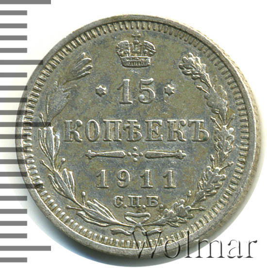 В центре указан номинал «15», ограниченный с обеих сторон звездочками. Над цифрой – Корона Российской империи. Под цифрой номинала — слово "КОПЕЕК". Ниже, расположен декоративный разделитель в виде двух разнонаправленных фигурных линий и стилизованным из точек крестом между ними. Под разделителем — дата выпуска монеты «1911». Под цифрой даты — обозначение монетного двора «С.П.Б.». Вдоль канта, не доходя до короны, изображен венок из лавровой и дубовой ветви, которые в нижней части перевязаны лентой на узел бантом. По окружности канта имеются рельефные элементы, выполненные в виде зубцов.