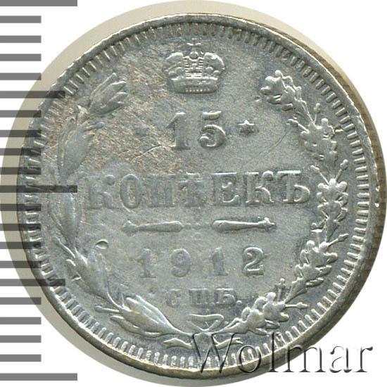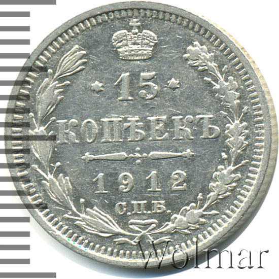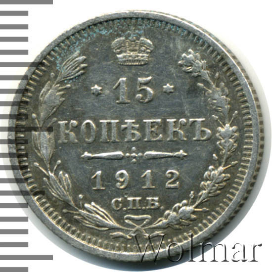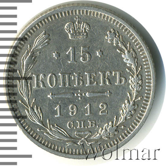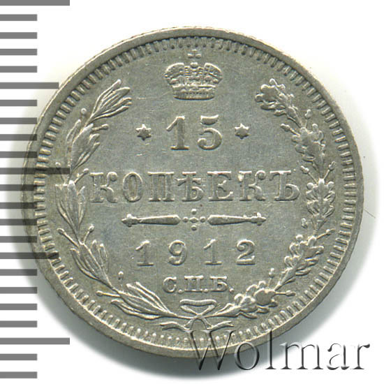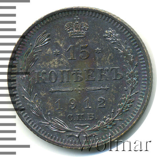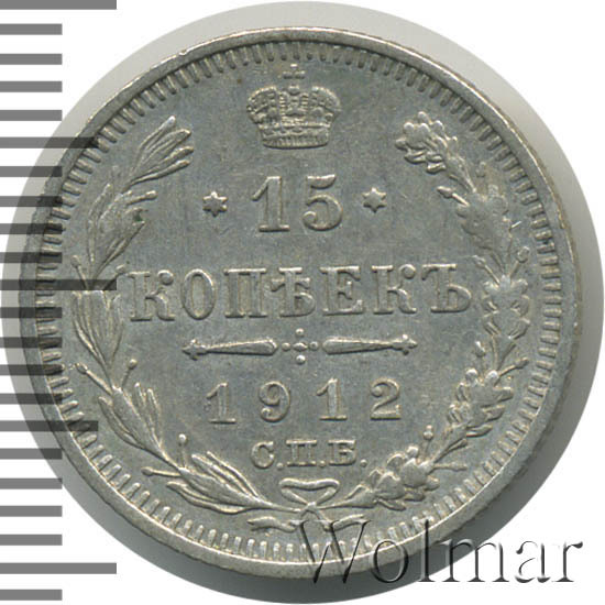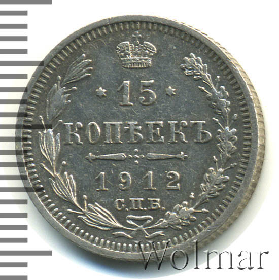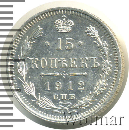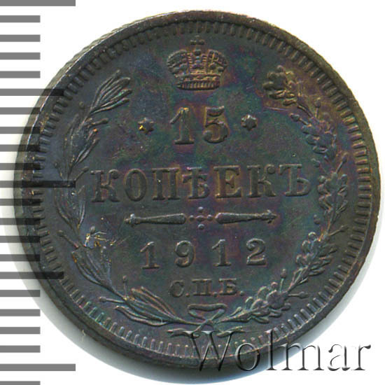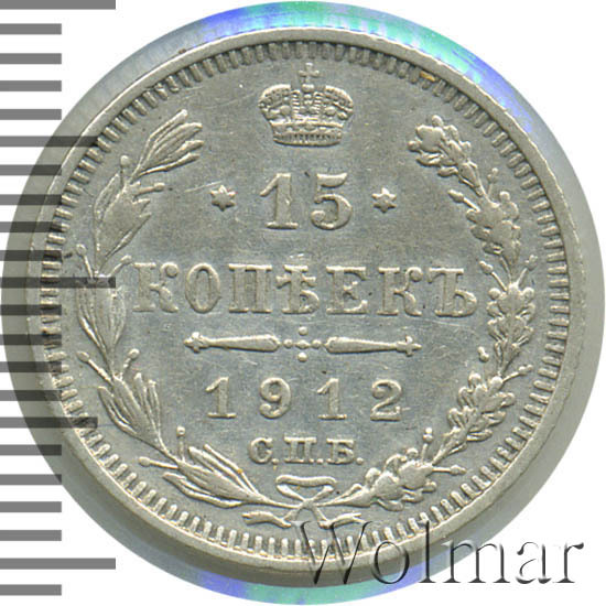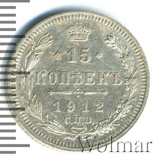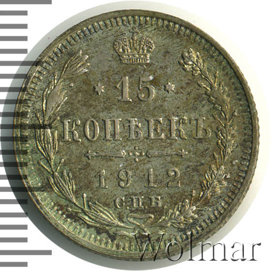 в центре указан номинал «15», ограниченный с обеих сторон звездочками. Над цифрой – Корона Российской империи. Под цифрой номинала — слово "КОПЕЕК". Ниже, расположен декоративный разделитель в виде двух разнонаправленных фигурных линий и стилизованным из точек крестом между ними. Под разделителем — дата выпуска монеты «1912». Под цифрой даты — обозначение монетного двора «С.П.Б.». Вдоль канта, не доходя до короны, изображен венок из лавровой и дубовой ветви, которые в нижней части перевязаны лентой на узел бантом. По окружности канта имеются рельефные элементы, выполненные в виде зубцов.