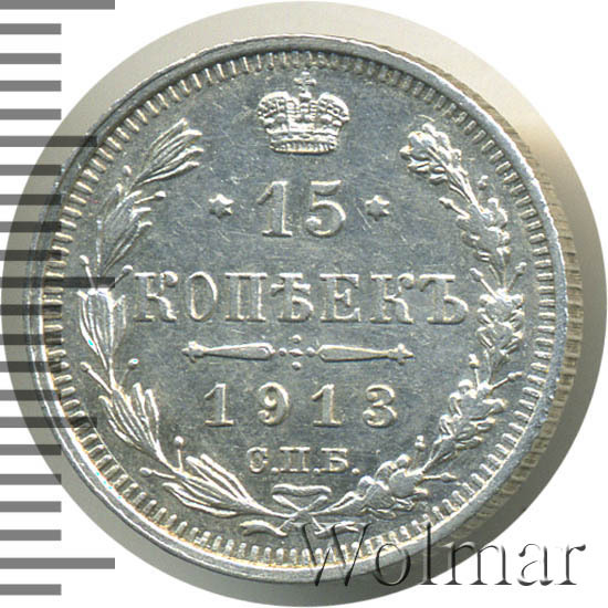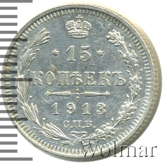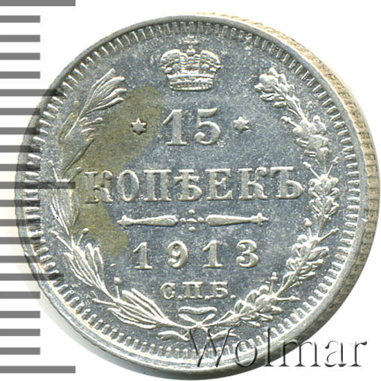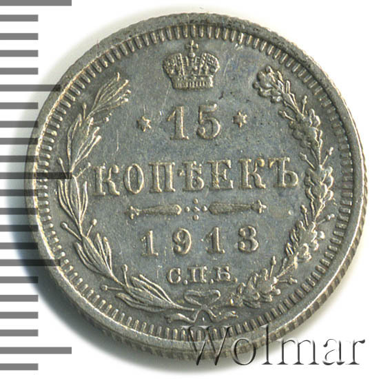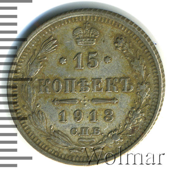 Реверс монеты 15 копеек 1913 года СПБ-ВС