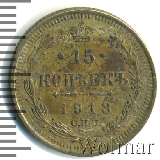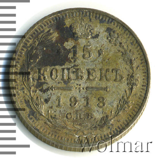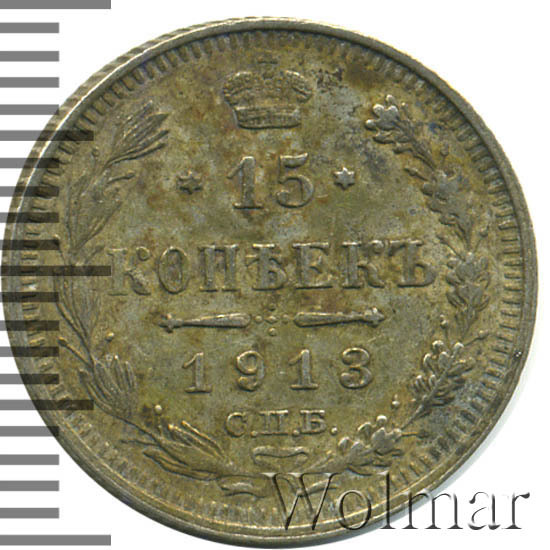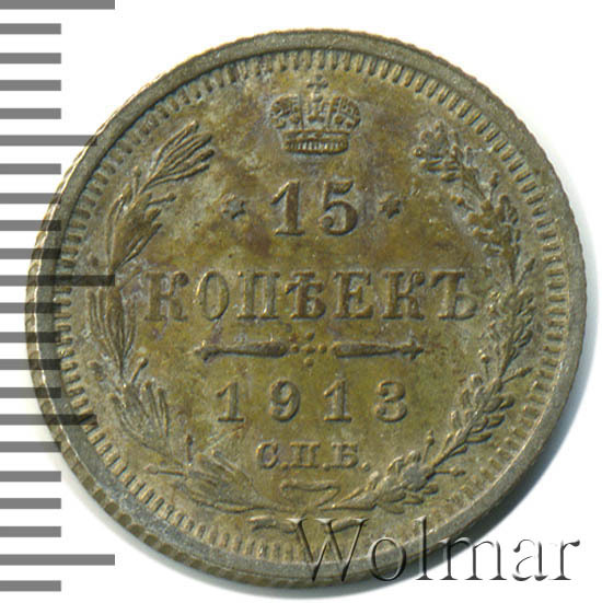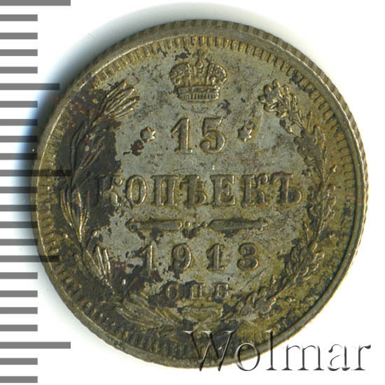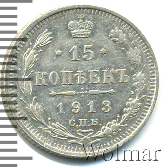 В центре указан номинал «15», ограниченный с обеих сторон звездочками. Над цифрой – Корона Российской империи. Под цифрой номинала — слово "КОПЕЕК". Ниже, расположен декоративный разделитель в виде двух разнонаправленных фигурных линий и стилизованным из точек крестом между ними. Под разделителем — дата выпуска монеты «1913». Под цифрой даты — обозначение монетного двора «С.П.Б.». Вдоль канта, не доходя до короны, изображен венок из лавровой и дубовой ветви, которые в нижней части перевязаны лентой на узел бантом. По окружности канта имеются рельефные элементы, выполненные в виде зубцов.