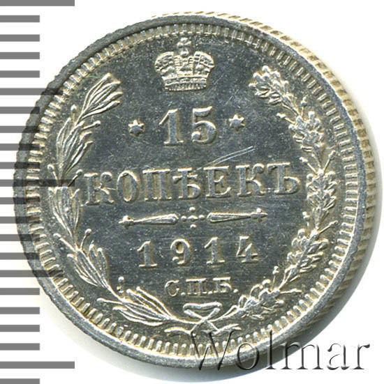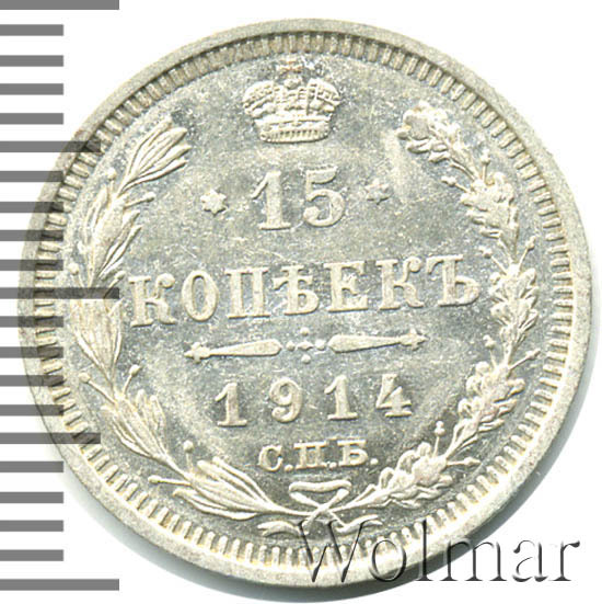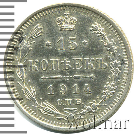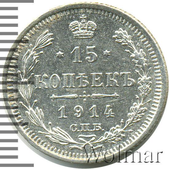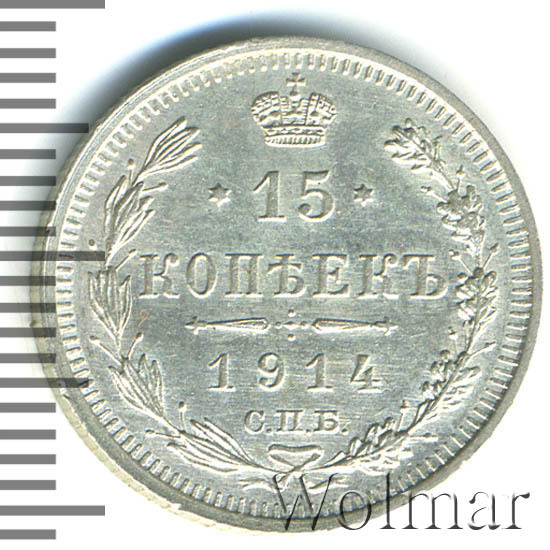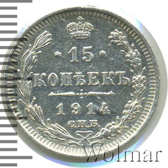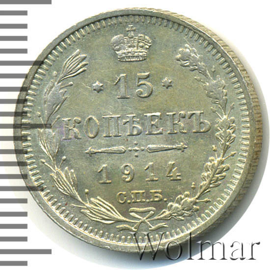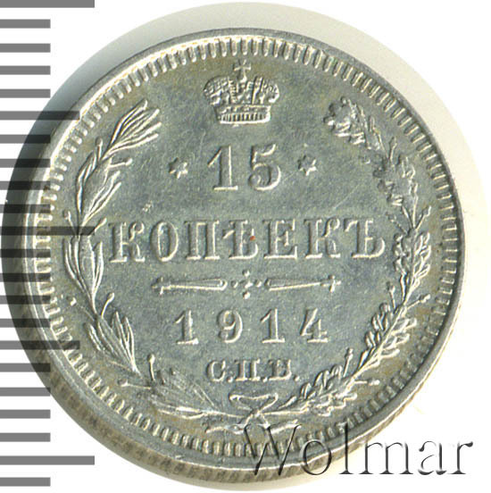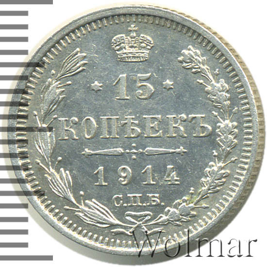 В центре указан номинал «15», ограниченный с обеих сторон звездочками. Над цифрой – Корона Российской империи. Под цифрой номинала — слово "КОПЕЕК". Ниже, расположен декоративный разделитель в виде двух разнонаправленных фигурных линий и стилизованным из точек крестом между ними. Под разделителем — дата выпуска монеты «1914». Под цифрой даты — обозначение монетного двора «С.П.Б.». Вдоль канта, не доходя до короны, изображен венок из лавровой и дубовой ветви, которые в нижней части перевязаны лентой на узел бантом. По окружности канта имеются рельефные элементы, выполненные в виде зубцов.