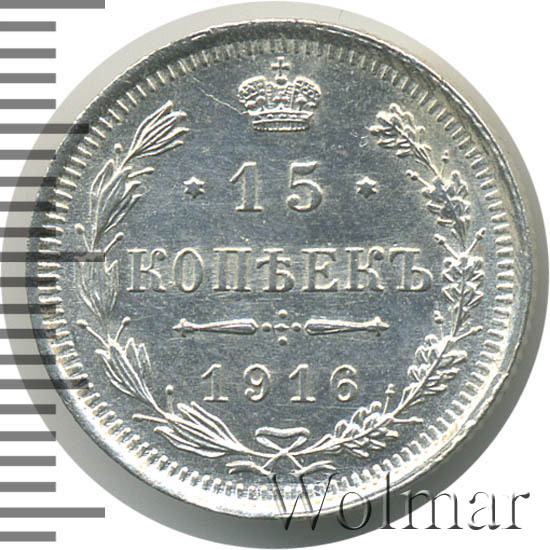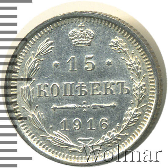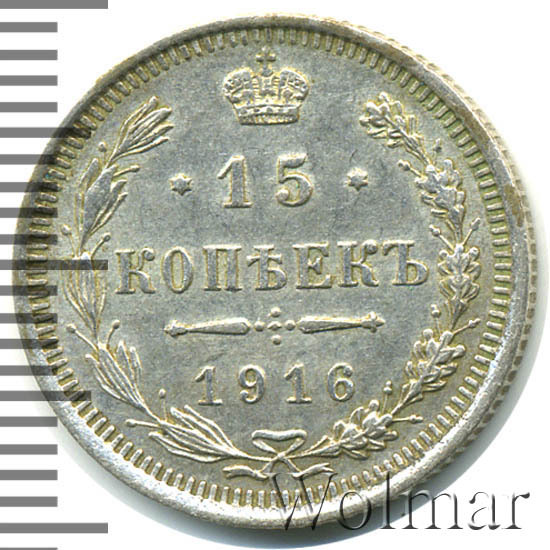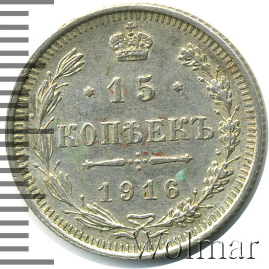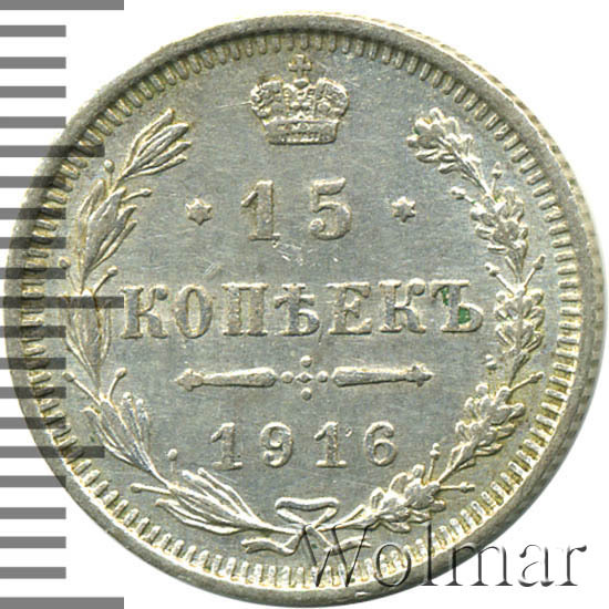 Данный тип монет чеканился в неизменном (за очень редким исключением) виде 1860 по 1917 гг. 15 копеек 1916 года, рядовая серебряная монета, выпущенная в предпоследний год существования огромного по территории государства - Российской Империи. Отчеканенная, в период правления императора Николая Второго, на Санкт – Петербургском монетном дворе (также, этот номинал в 15 коп. , чеканился на мон. дворе японского города Осака). Инициалы В.С., на аверсе, принадлежат минцмейстеру Виктору Смирнову, работавшему на СПМД в 1912 -1917 гг.