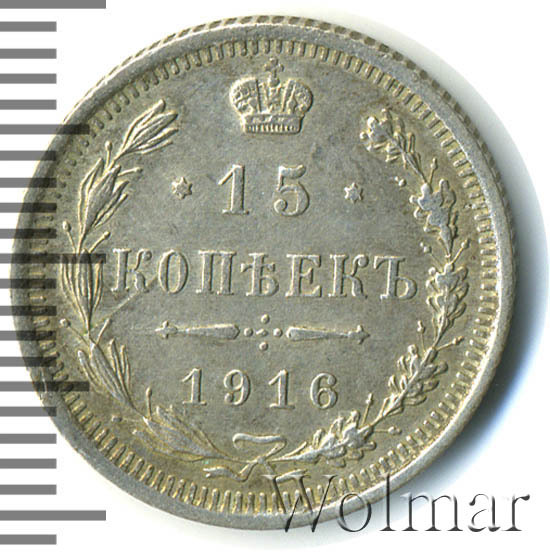 В центре указан номинал «15», ограниченный с обеих сторон звездочками. Над цифрой – Корона Российской империи. Под цифрой номинала — слово "КОПЕЕК". Ниже, расположен декоративный разделитель в виде двух разнонаправленных фигурных линий и стилизованным из точек крестом между ними. Под разделителем — дата выпуска монеты «1916». Вдоль канта, не доходя до короны, изображен венок из лавровой и дубовой ветви, которые в нижней части перевязаны лентой на узел бантом. По окружности канта имеются рельефные элементы, выполненные в виде зубцов.
