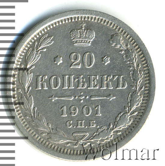 20 копеек 1901-1917 годов чеканились на Санкт-Петербургском монетном дворе из серебра 48 золотниковой (500 метрической) пробы весом 3.6 г.