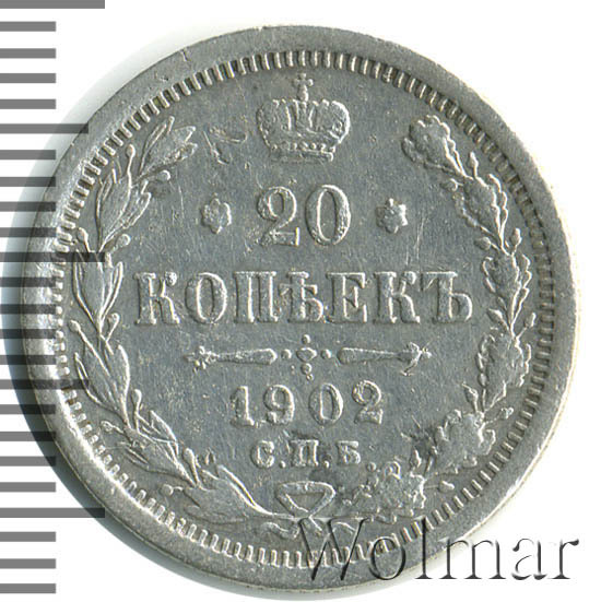 В центре указан номинал - цифра «20», ограниченная с обеих сторон звездочками. Над цифрой – Корона Российской империи. Под цифрой номинала — слово "КОПЕЕК". Ниже, расположен декоративный разделитель в виде двух разнонаправленных фигурных линий и стилизованным из точек крестом между ними. Под разделителем — дата выпуска монеты «1902». Под цифрой даты — обозначение монетного двора «С.П.Б.». Вдоль канта, не доходя до короны, изображен венок из лавровой и дубовой ветвей, которые, в нижней части, перевязаны лентой на узел бантом. По окружности канта имеются рельефные элементы, выполненные в виде зубцов.