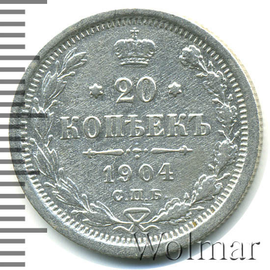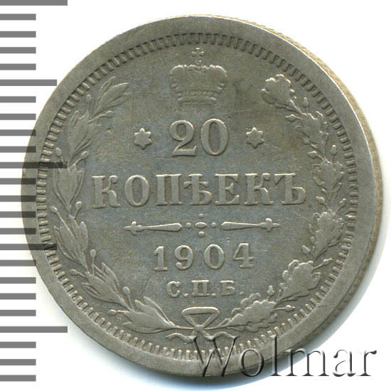 В центре указан номинал - цифра «20», ограниченная с обеих сторон звездочками. Над цифрой – Корона Российской империи. Под цифрой номинала — слово "КОПЕЕК". Ниже, расположен декоративный разделитель в виде двух разнонаправленных фигурных линий и стилизованным из точек крестом между ними. Под разделителем — дата выпуска монеты «1904». Под цифрой даты — обозначение монетного двора «С.П.Б.». Вдоль канта, не доходя до короны, изображен венок из лавровой и дубовой ветвей, которые, в нижней части, перевязаны лентой на узел бантом. По окружности канта имеются рельефные элементы, выполненные в виде зубцов.
