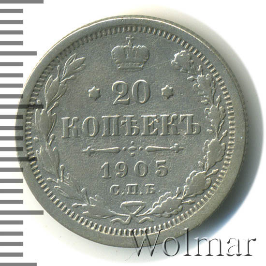 В центре указан номинал - цифра «20», ограниченная с обеих сторон звездочками. Над цифрой – Корона Российской империи. Под цифрой номинала — слово "КОПЕЕК". Ниже, расположен декоративный разделитель в виде двух разнонаправленных фигурных линий и стилизованным из точек крестом между ними. Под разделителем — дата выпуска монеты «1905». Под цифрой даты — обозначение монетного двора «С.П.Б.». Вдоль канта, не доходя до короны, изображен венок из лавровой и дубовой ветвей, которые, в нижней части, перевязаны лентой на узел бантом. По окружности канта имеются рельефные элементы, выполненные в виде зубцов.
