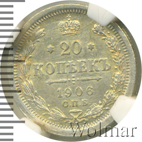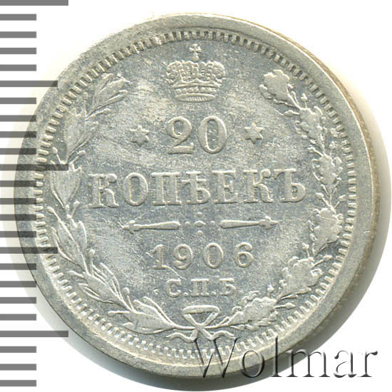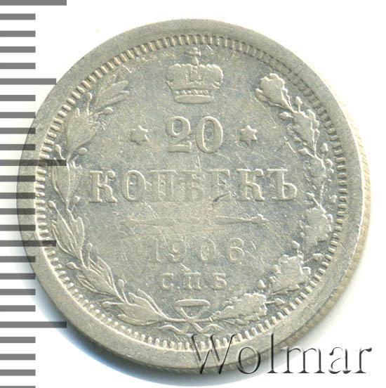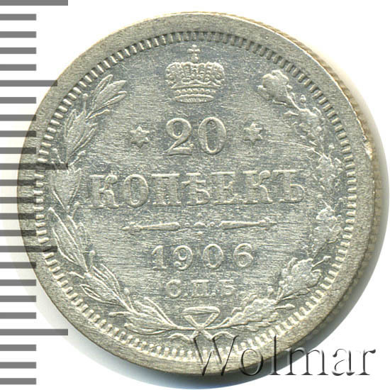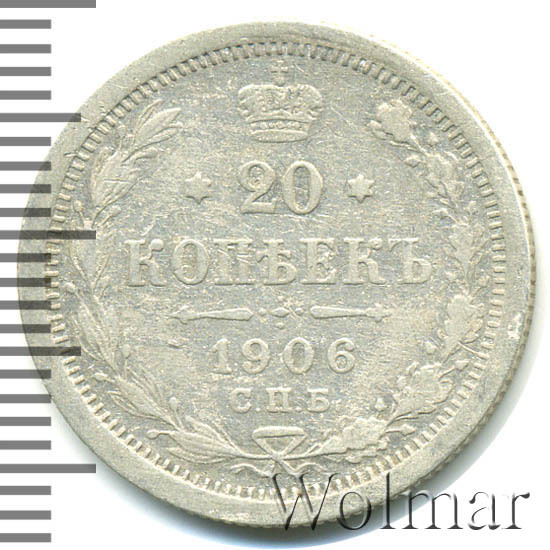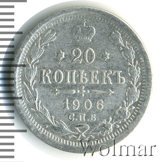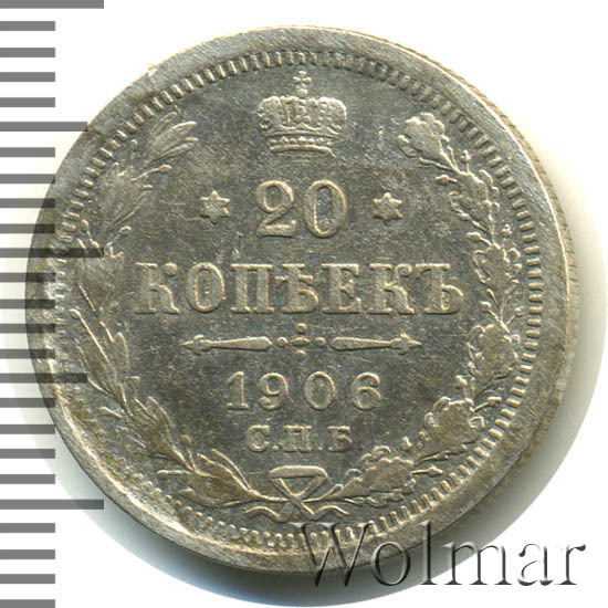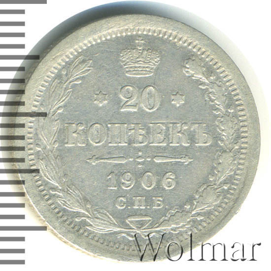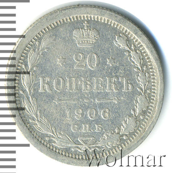 В центре указан номинал - цифра «20», ограниченная с обеих сторон звездочками. Над цифрой – Корона Российской империи. Под цифрой номинала — слово "КОПЕЕК". Ниже, расположен декоративный разделитель в виде двух разнонаправленных фигурных линий и стилизованным из точек крестом между ними. Под разделителем — дата выпуска монеты «1906». Под цифрой даты — обозначение монетного двора «С.П.Б.». Вдоль канта, не доходя до короны, изображен венок из лавровой и дубовой ветвей, которые, в нижней части, перевязаны лентой на узел бантом. По окружности канта имеются рельефные элементы, выполненные в виде зубцов.