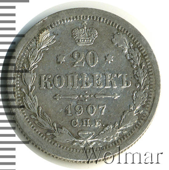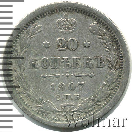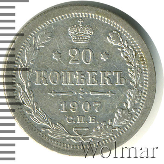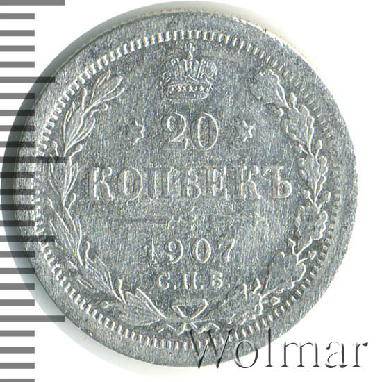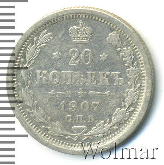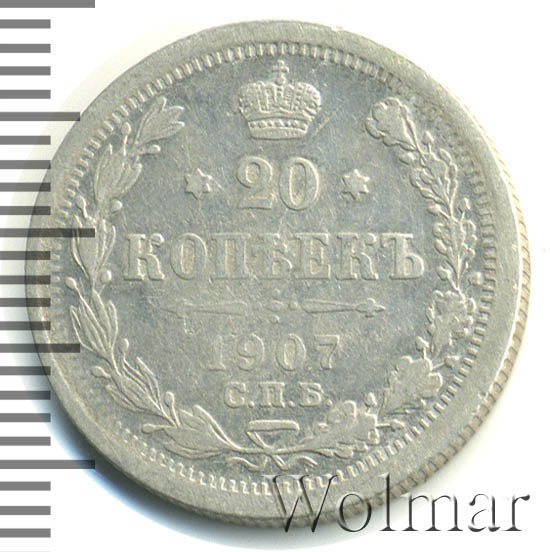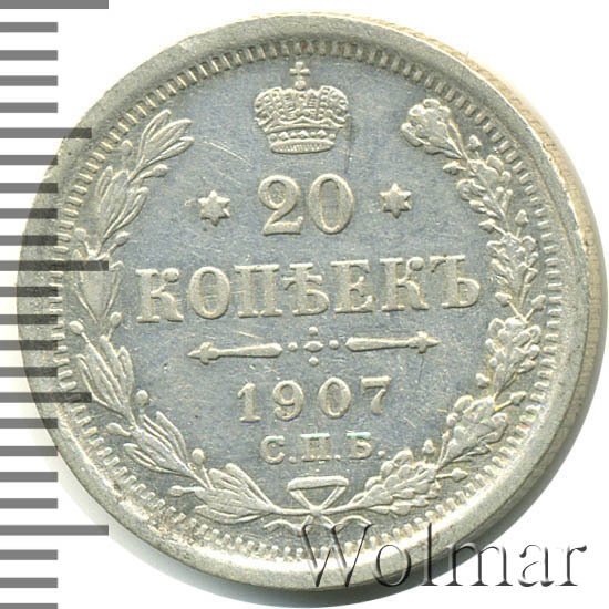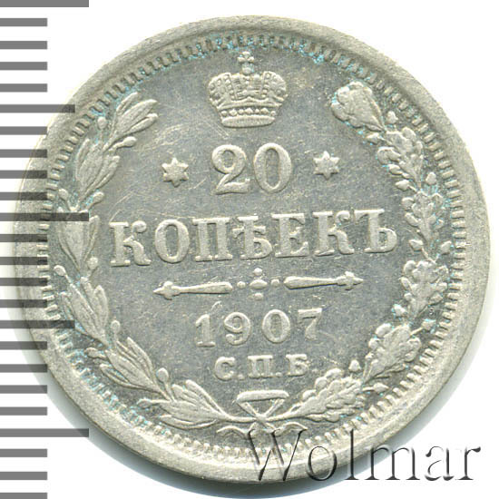 В центре указан номинал - цифра «20», ограниченная с обеих сторон звездочками. Над цифрой – Корона Российской империи. Под цифрой номинала — слово "КОПЕЕК". Ниже, расположен декоративный разделитель в виде двух разнонаправленных фигурных линий и стилизованным из точек крестом между ними. Под разделителем — дата выпуска монеты «1907». Под цифрой даты — обозначение монетного двора «С.П.Б.». Вдоль канта, не доходя до короны, изображен венок из лавровой и дубовой ветвей, которые, в нижней части, перевязаны лентой на узел бантом. По окружности канта имеются рельефные элементы, выполненные в виде зубцов.