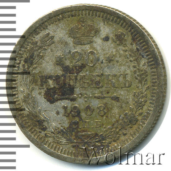 В центре указан номинал - цифра «20», ограниченная с обеих сторон звездочками. Над цифрой – Корона Российской империи. Под цифрой номинала — слово "КОПЕЕК". Ниже, расположен декоративный разделитель в виде двух разнонаправленных фигурных линий и стилизованным из точек крестом между ними. Под разделителем — дата выпуска монеты «1908». Под цифрой даты — обозначение монетного двора «С.П.Б.». Вдоль канта, не доходя до короны, изображен венок из лавровой и дубовой ветвей, которые, в нижней части, перевязаны лентой на узел бантом. По окружности канта имеются рельефные элементы, выполненные в виде зубцов.