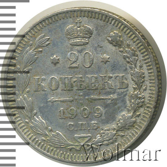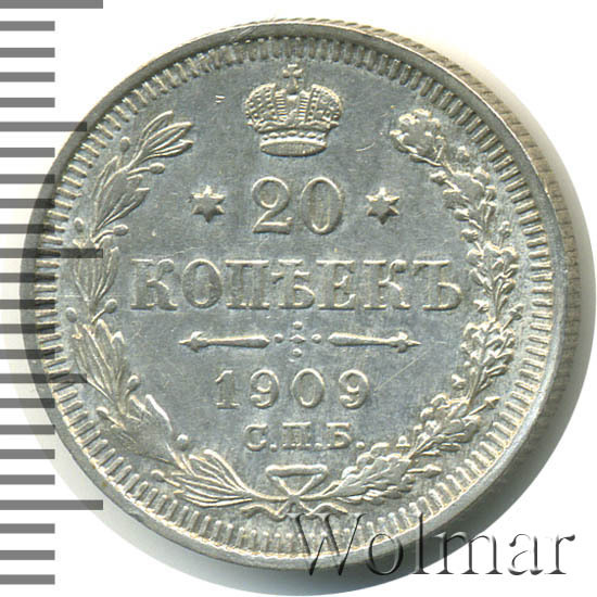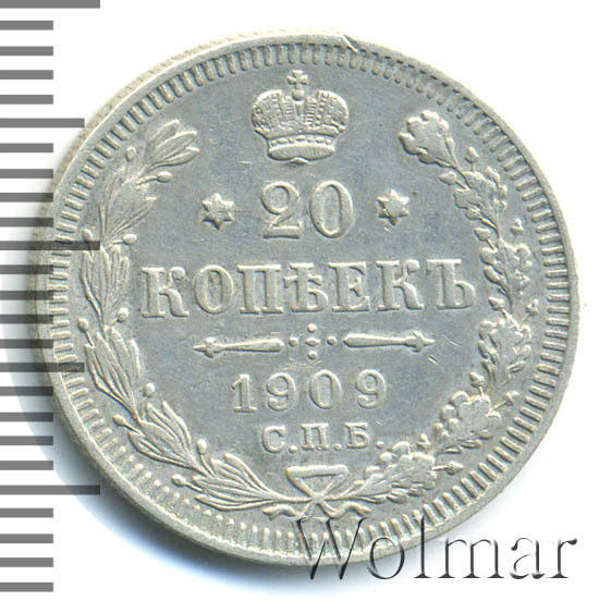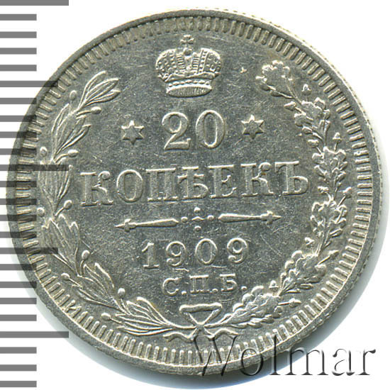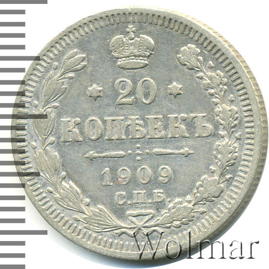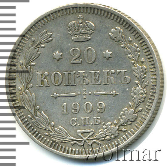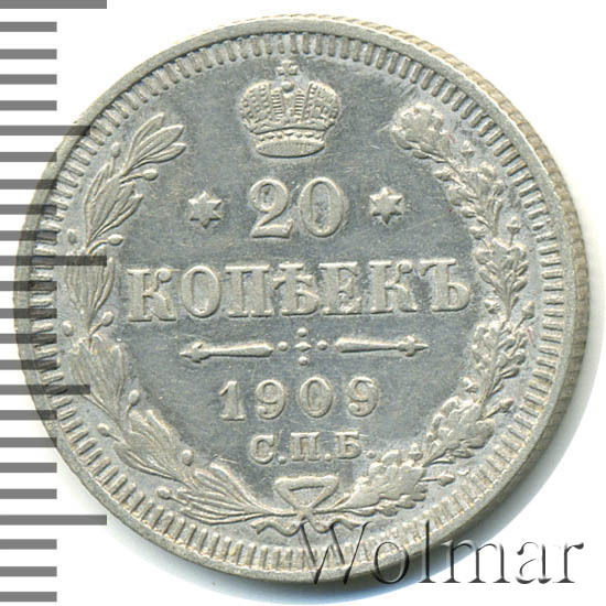 В центре указан номинал - цифра «20», ограниченная с обеих сторон звездочками. Над цифрой – Корона Российской империи. Под цифрой номинала — слово "КОПЕЕК". Ниже, расположен декоративный разделитель в виде двух разнонаправленных фигурных линий и стилизованным из точек крестом между ними. Под разделителем — дата выпуска монеты «1909». Под цифрой даты — обозначение монетного двора «С.П.Б.». Вдоль канта, не доходя до короны, изображен венок из лавровой и дубовой ветвей, которые, в нижней части, перевязаны лентой на узел бантом. По окружности канта имеются рельефные элементы, выполненные в виде зубцов.