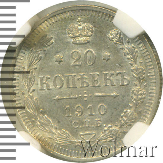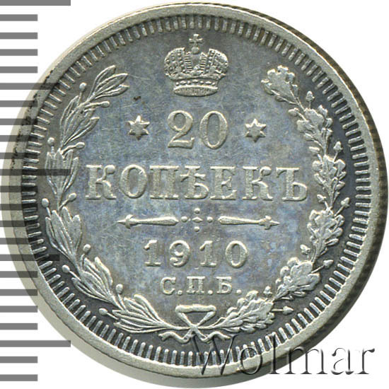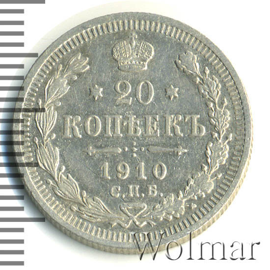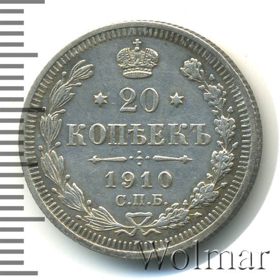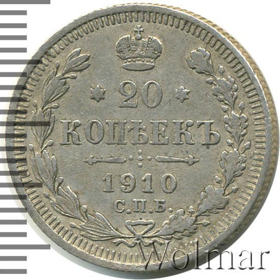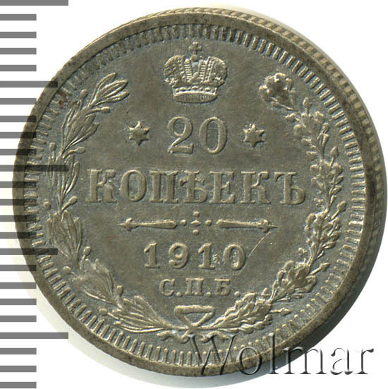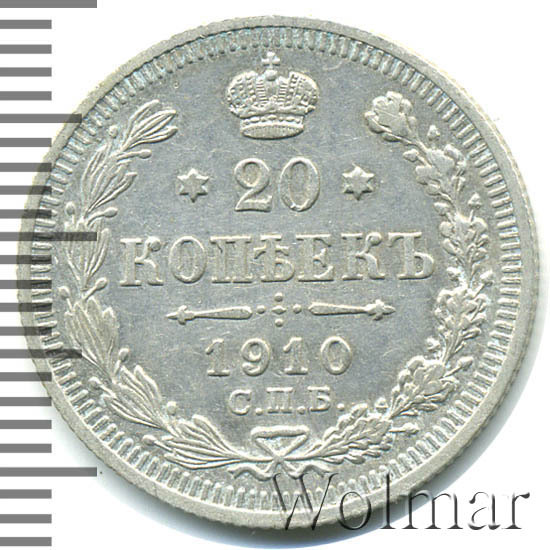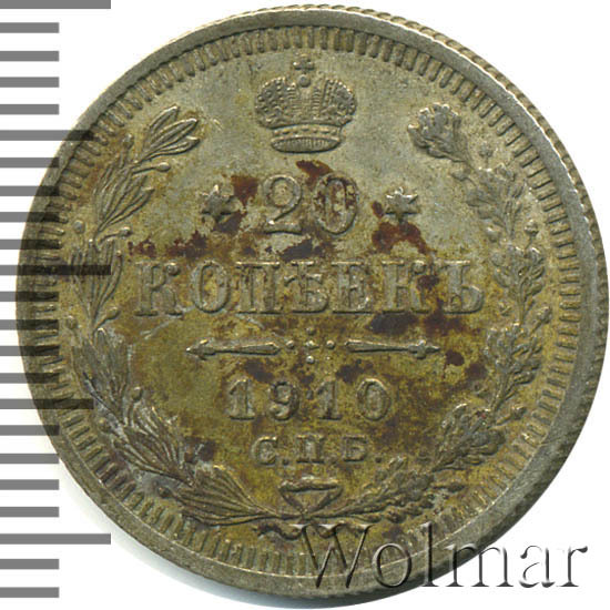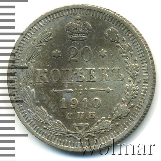 В центре указан номинал - цифра «20», ограниченная с обеих сторон звездочками. Над цифрой – Корона Российской империи. Под цифрой номинала — слово "КОПЕЕК". Ниже, расположен декоративный разделитель в виде двух разнонаправленных фигурных линий и стилизованным из точек крестом между ними. Под разделителем — дата выпуска монеты «1910». Под цифрой даты — обозначение монетного двора «С.П.Б.». Вдоль канта, не доходя до короны, изображен венок из лавровой и дубовой ветвей, которые, в нижней части, перевязаны лентой на узел бантом. По окружности канта имеются рельефные элементы, выполненные в виде зубцов.